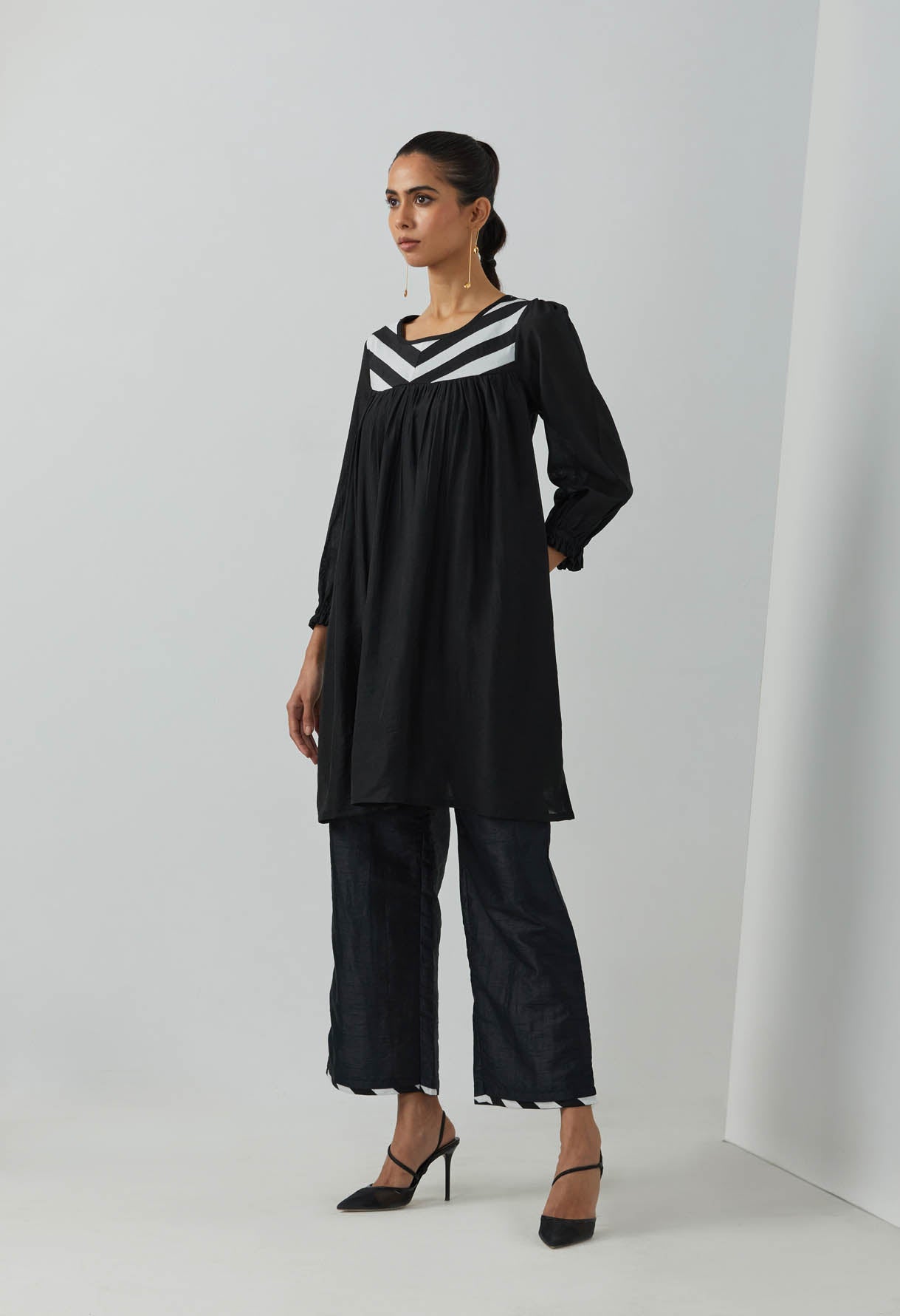 This chic gathered black tunic is crafted in chanderi silk and is adorned with chevron details on the neckline. The style is completed with elasticated sleeve detail.