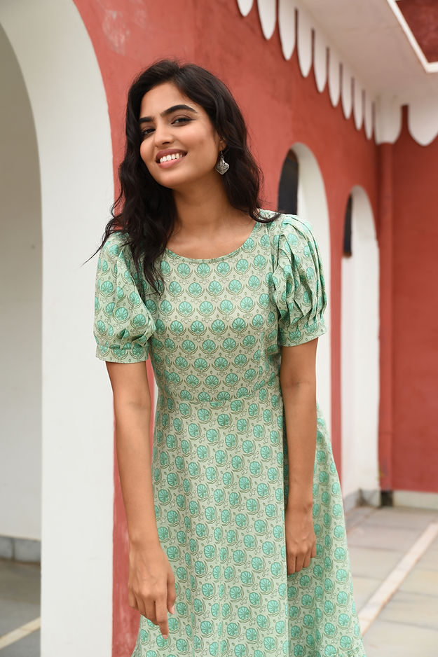 Green Block Printred Puff Sleeve Midi Custom Made Dress