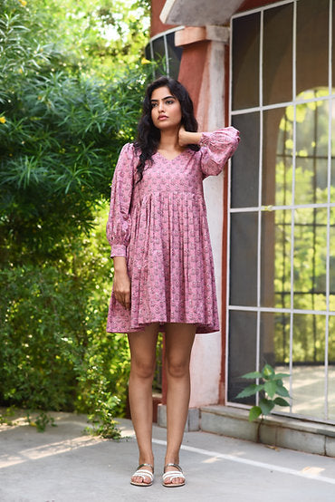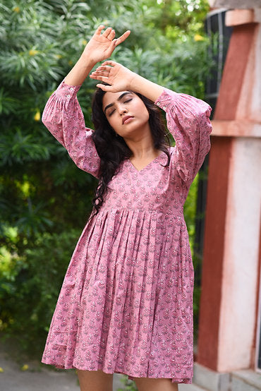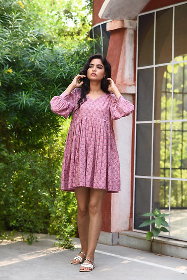Pink Block Printed V-Neck leated Custom Made Dress