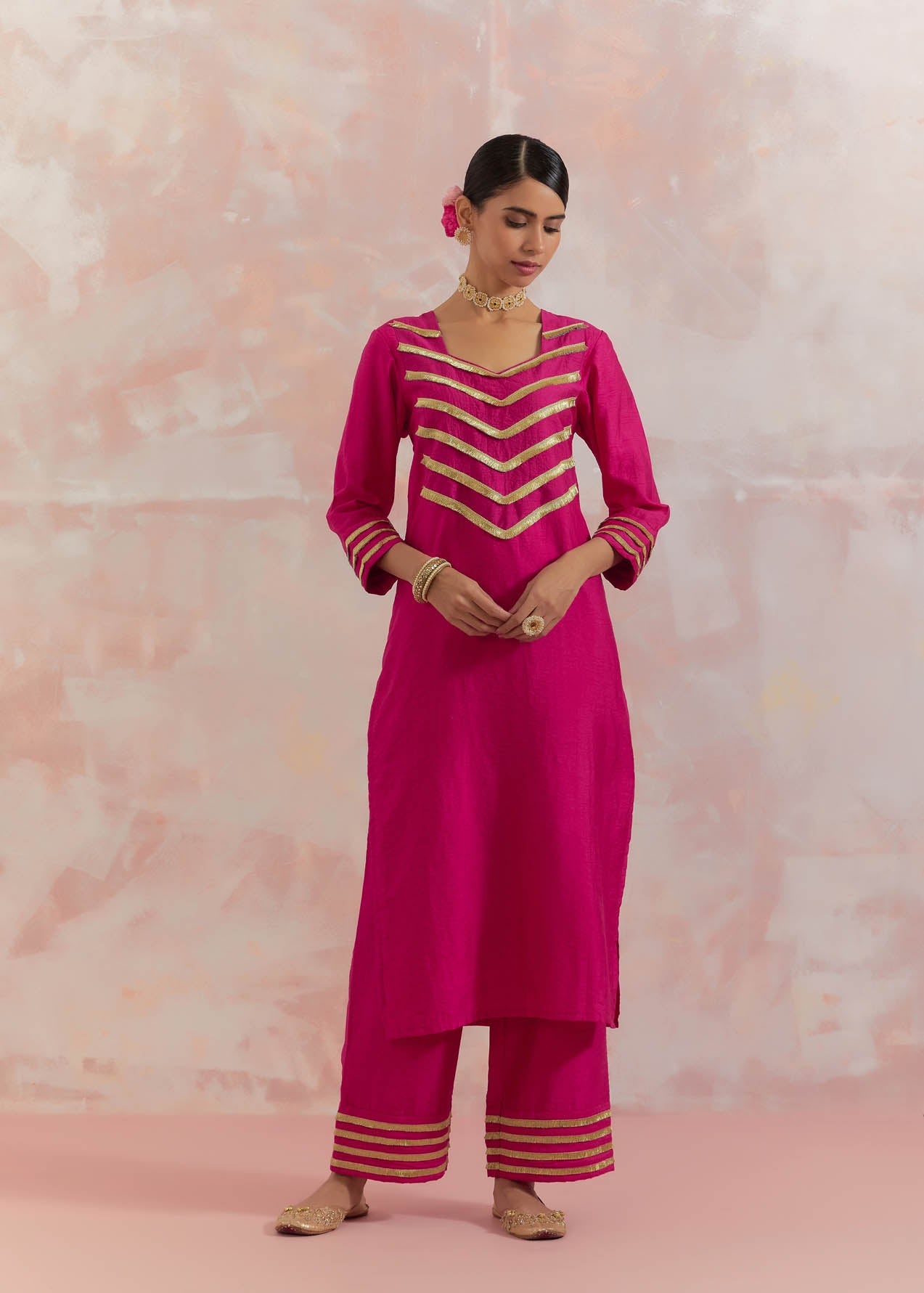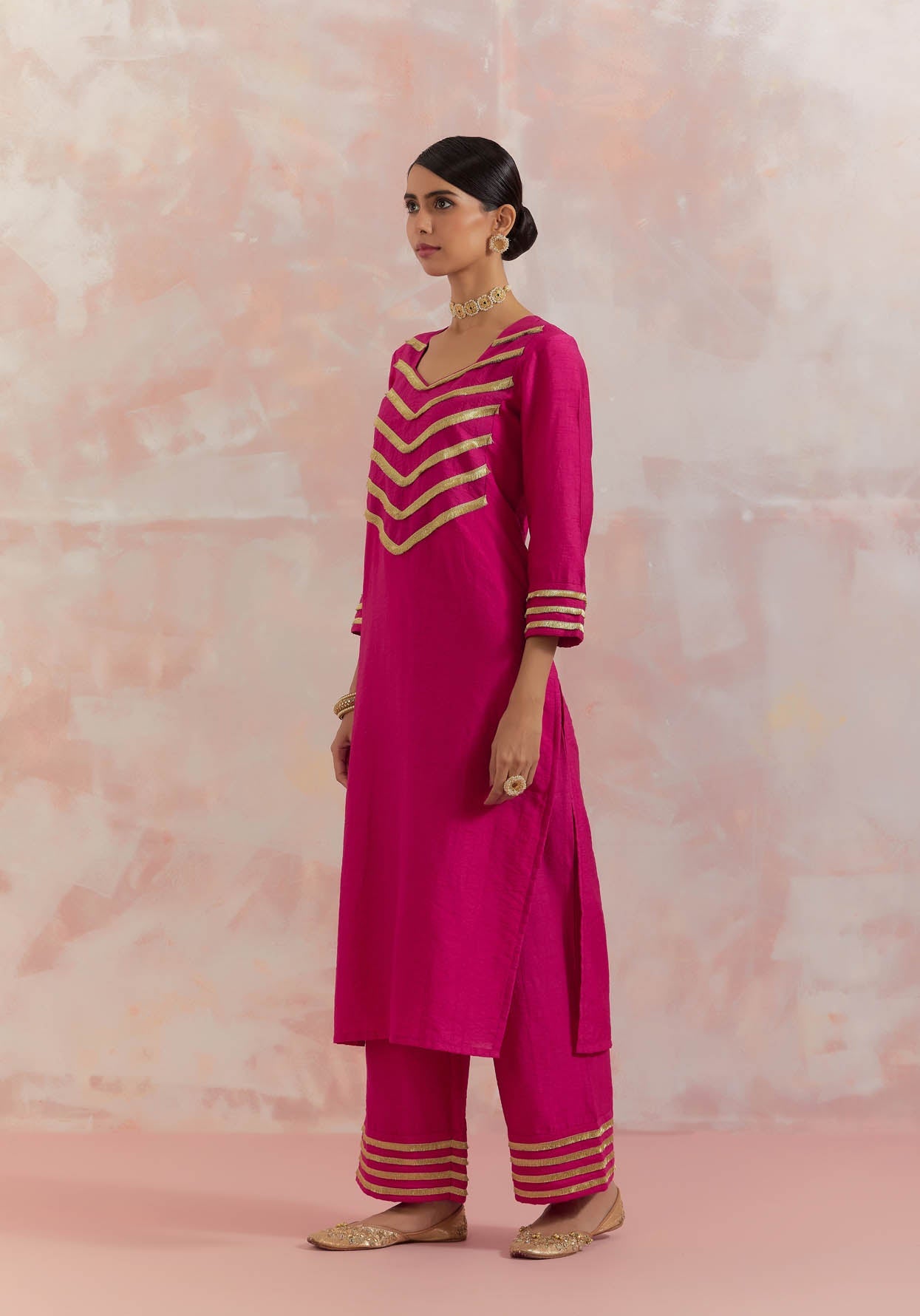 Raw Silk Straight kurta in bright pink color with kiran lace details on sleeves and yoke. This kurta set is paired with a chanderi zari stripe dupatta and palazzo pant with kiran lace details. Get the festive vibe going with this shimmery ensemble.