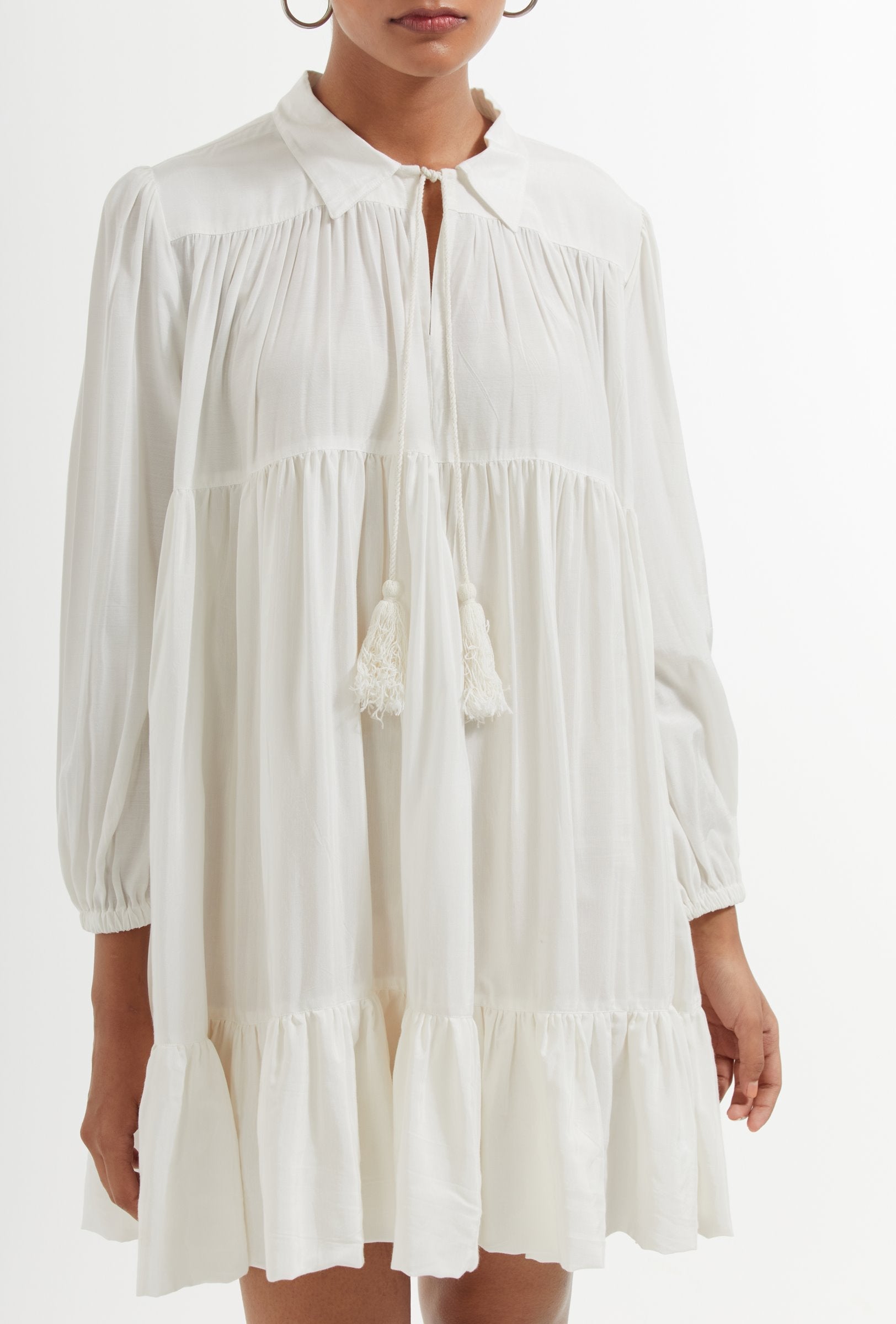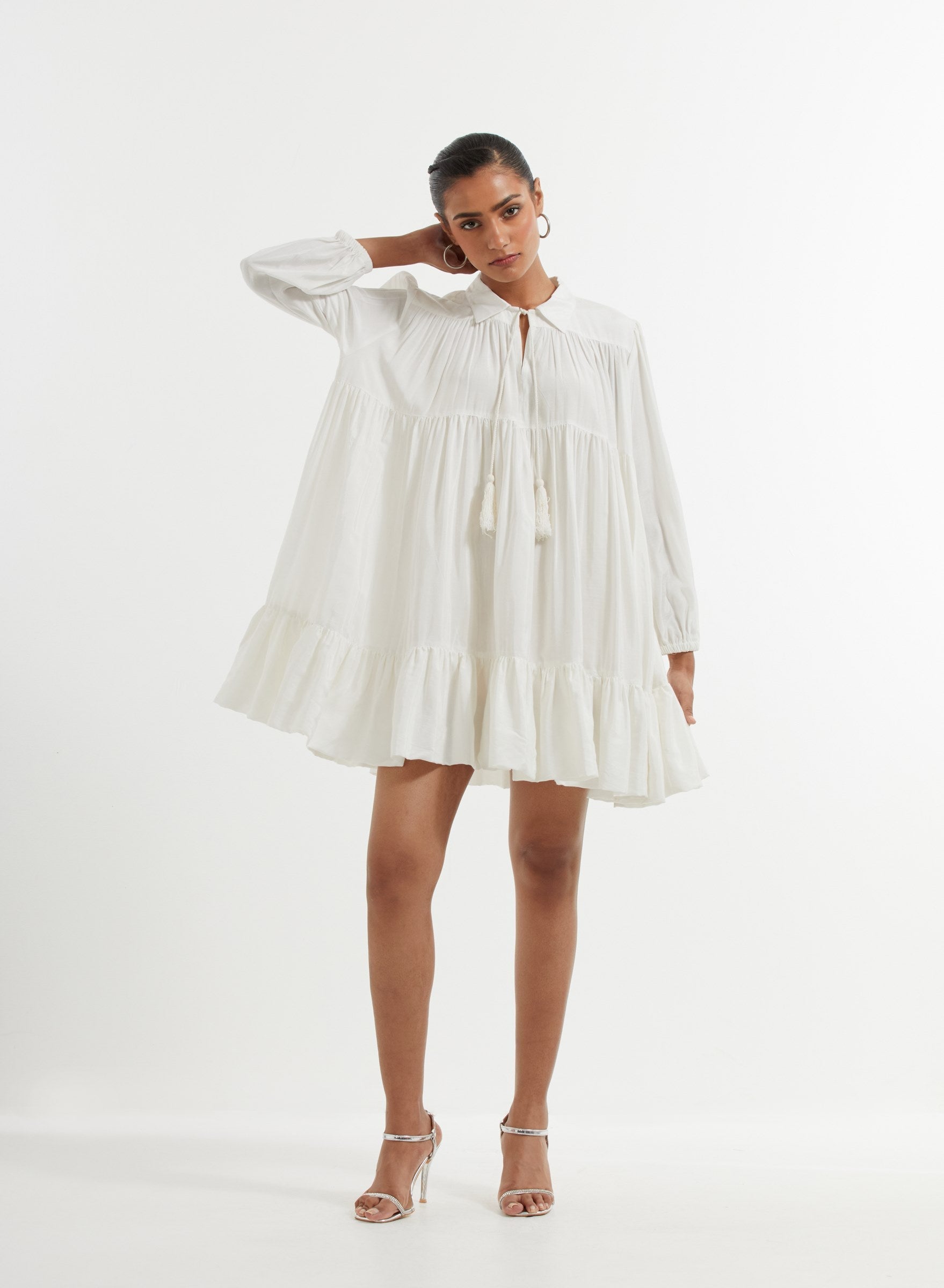 Developed out of the softest vibrant silk fabric, the Coral is a perfect choice for balmy nights and cocktails under the stars. With the collared neckline with twisted cotton cords with tassels, bell sleeves and significantly voluminous tiered body, it is the ultimate beach chic dress.