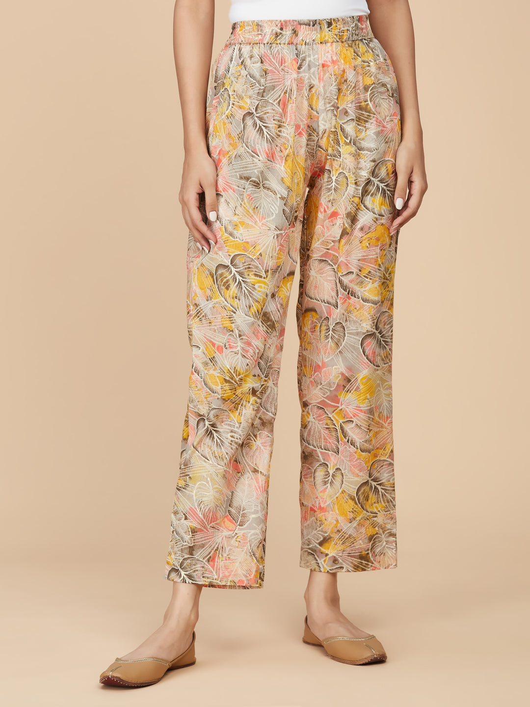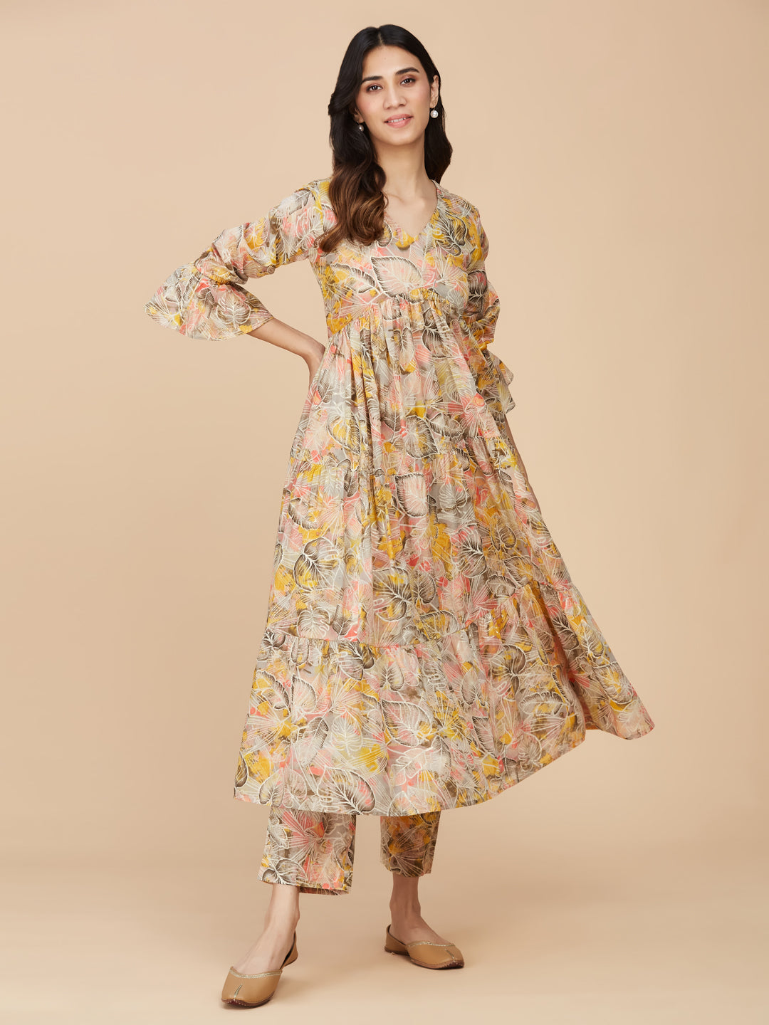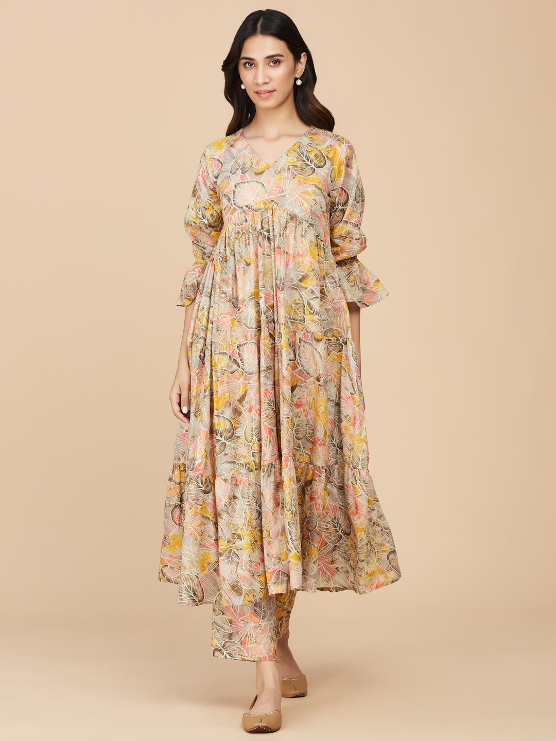 Yellow Printed Cotton Mull A-line Dress with Pant- Set of 2