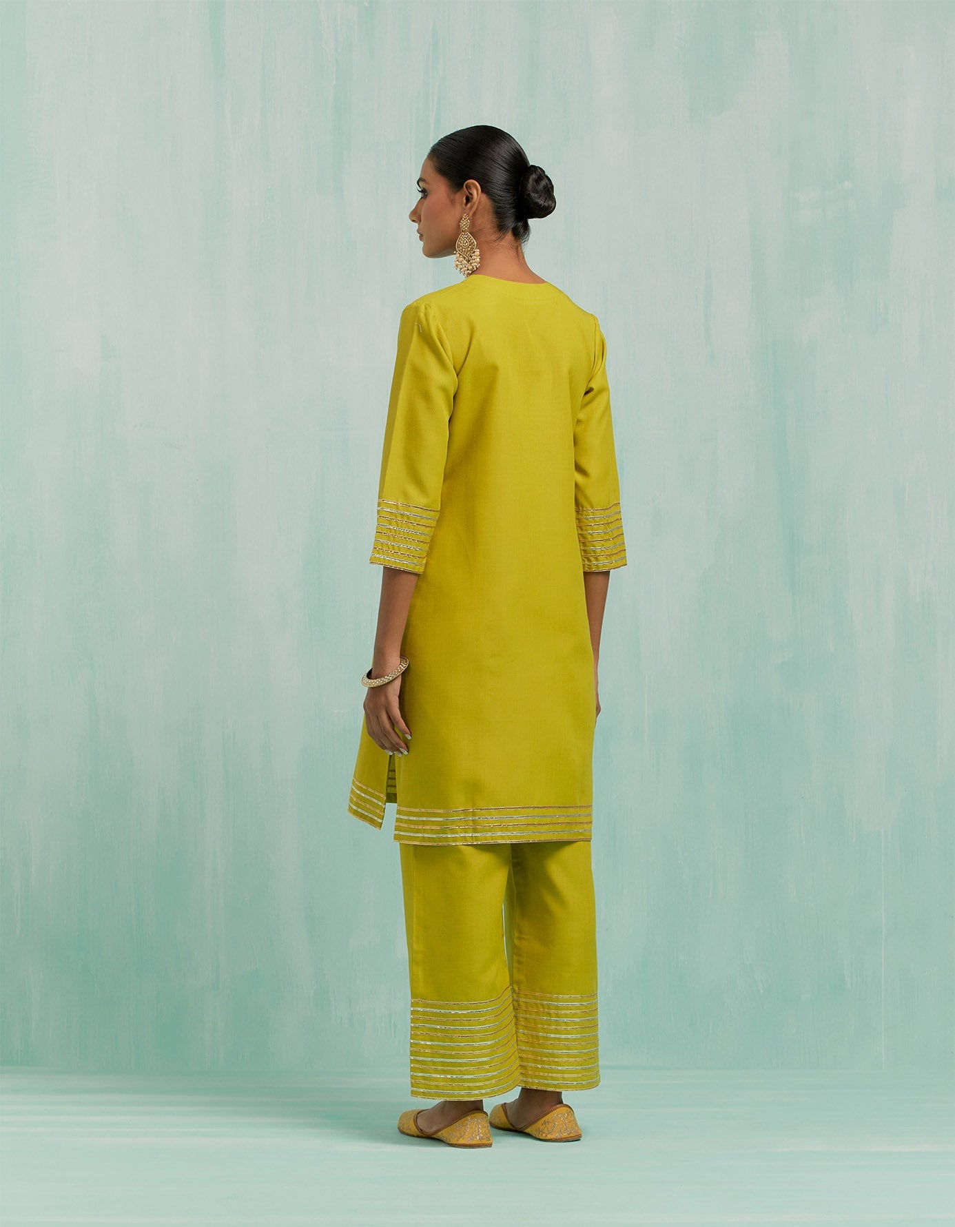 Capture the chic, elegant spirit of premium fashion with this stylish Lemon Green Kali Short Kurta and Palazzo set, featuring gorgeous gold and silver Gota details. Crafted with delicate Slub Cotton fabric, this sophisticated set delivers a timeless look of artistry with intricate details that will turn heads when you enter the room. Get your exclusive festive vibe on with this tasteful set for a sensational look.