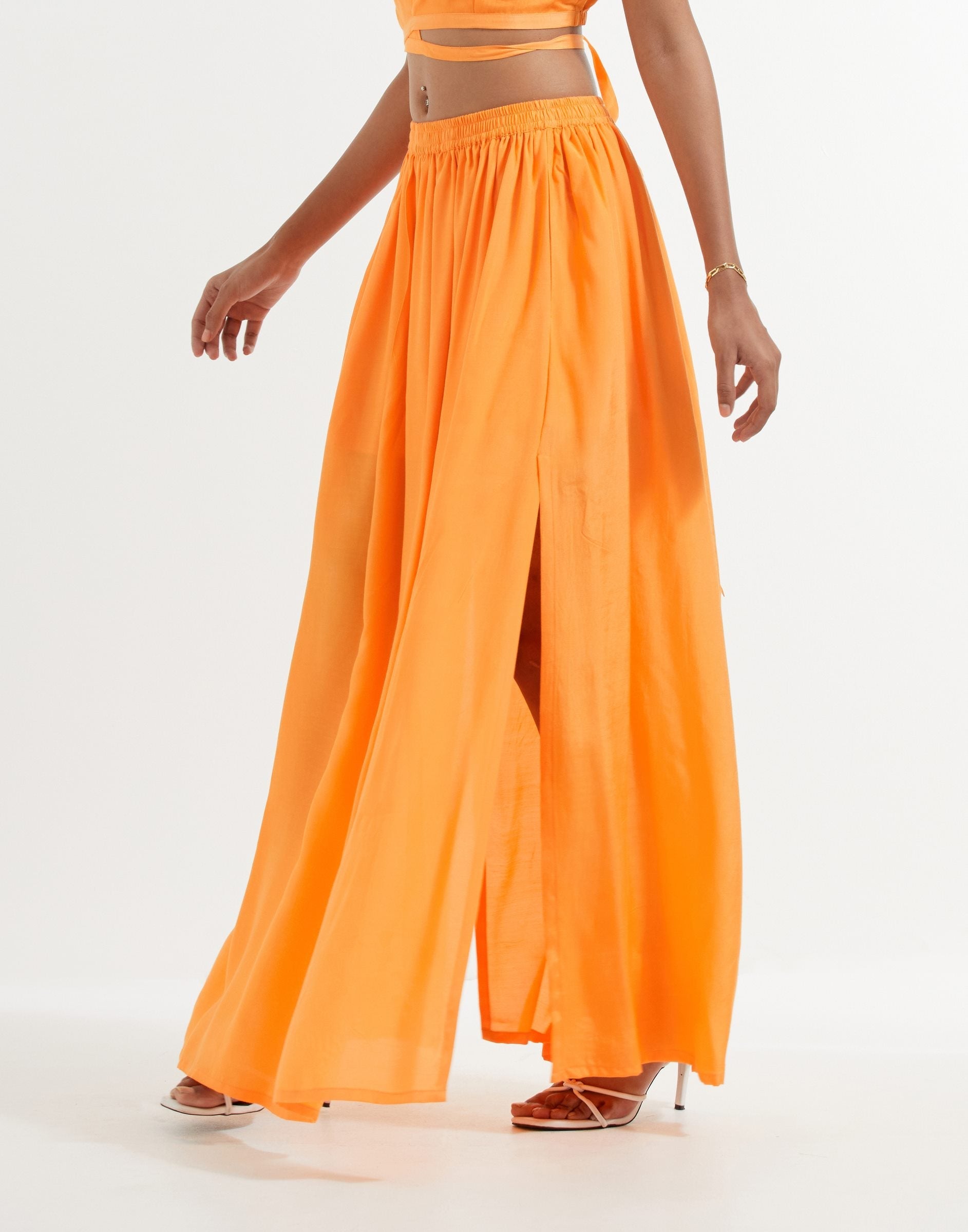 Marae is a long skirt crafted in softest vibrant silk fabric with bold slits at both sides. It is elasticated at the waist and also has pockets.