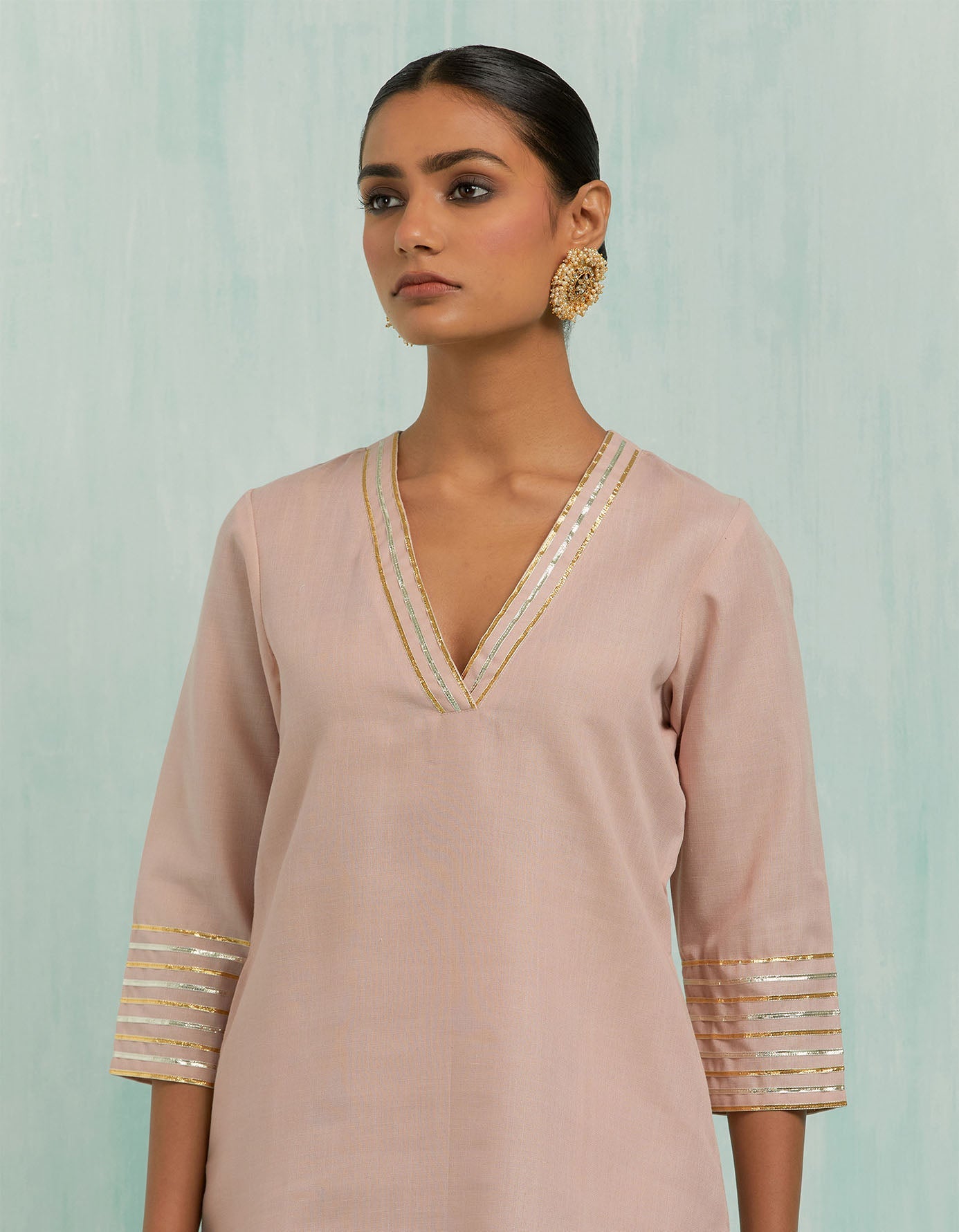 Pale Pink Kali Short Kurta And Palazzo With Gold Silver Gota Details (Set Of 2)