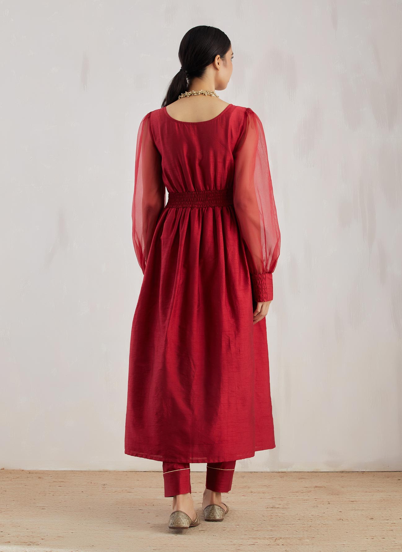 This V neck gathered kurta crafted in chanderi fabric features gold piping detail on the front. The dress is finished with elasticated back for utmost ease. It is creatively embellished with delicate organza sleeves. The kurta is paired with silk dupion pant.