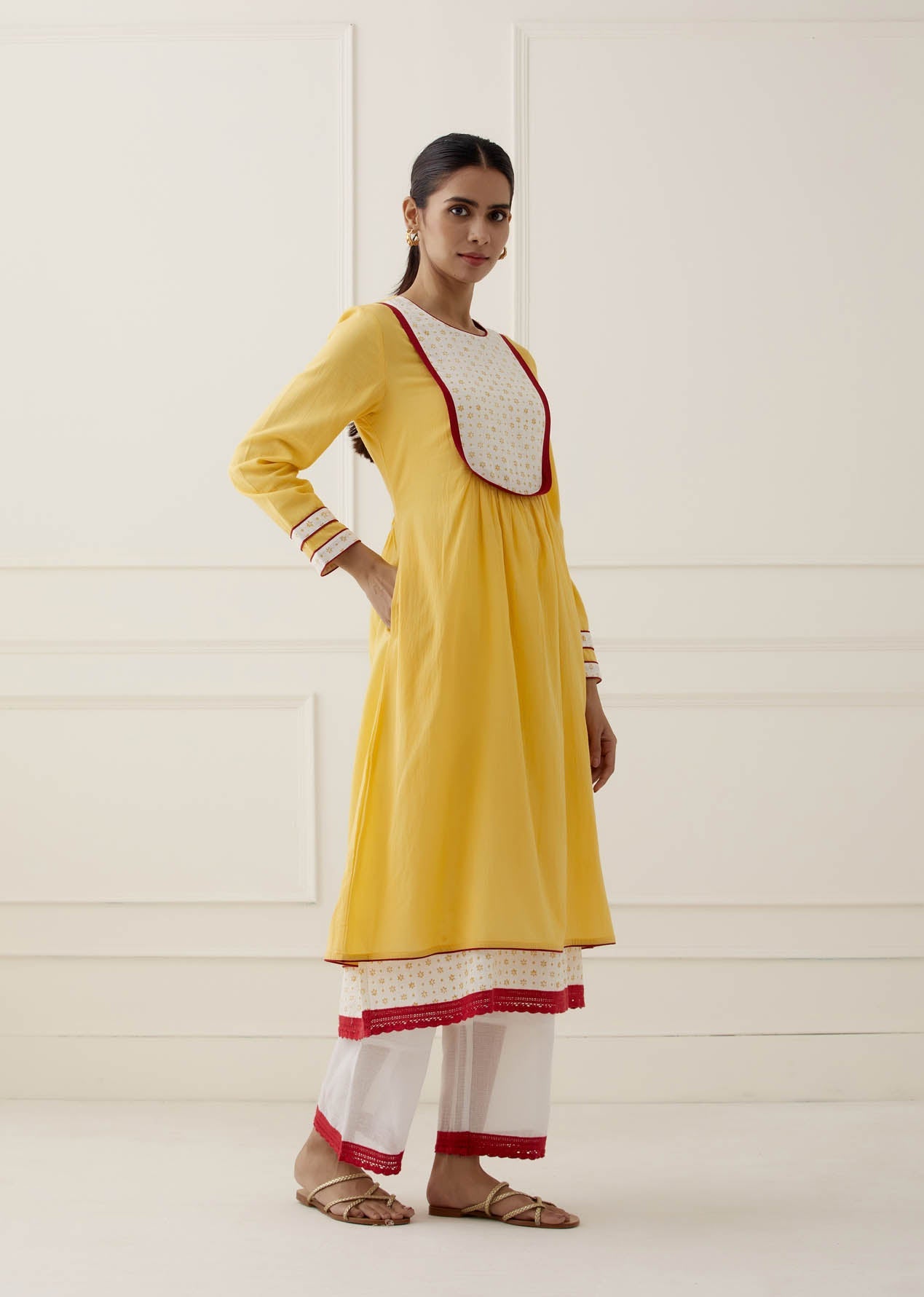 A beautiful kurta set such as this deserves a name that speaks for its beauty. Zaid comes with superbly crafted hand block printed fabric on the yoke and the sleeves. Made from cotton fabric, this is a timeless piece. Accessorize to make a statement with silver jewellery for a boho look or make it appropriate for workwear with muted neutrals and minimal accessories. This is a long kurta dress that comes with two pockets for your essentials. Pants are made in cotton and finished in kota fabric and lace.