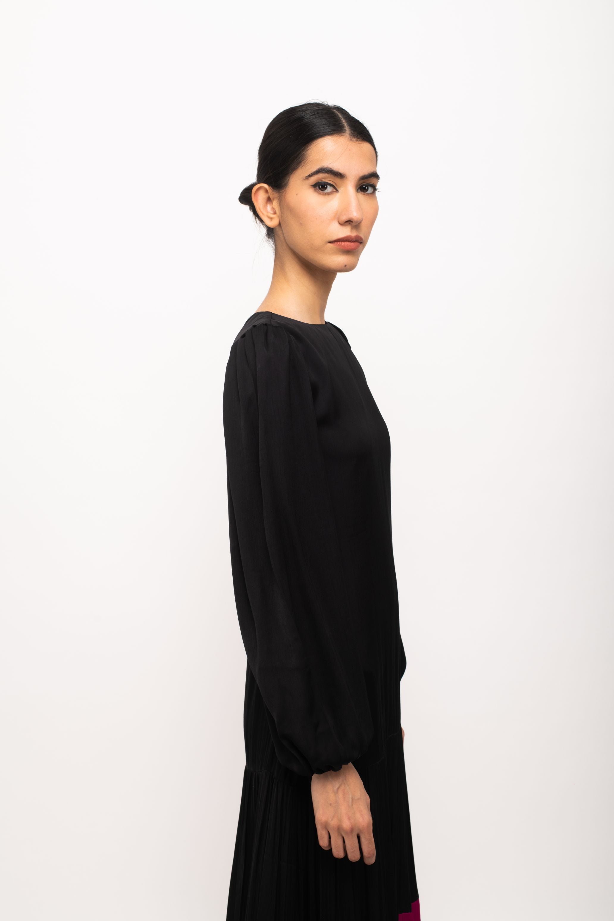 Black-Wine maxi dress with full sleeves and wine gathers at the end