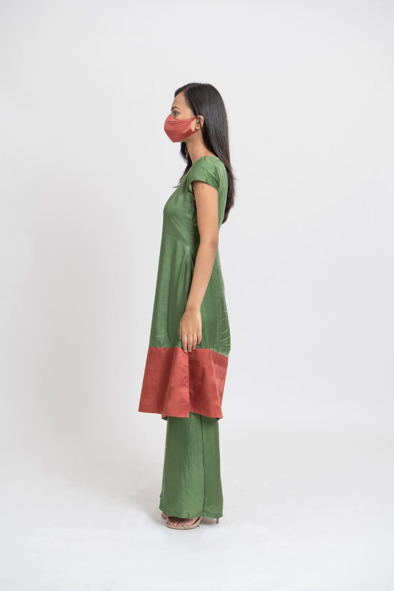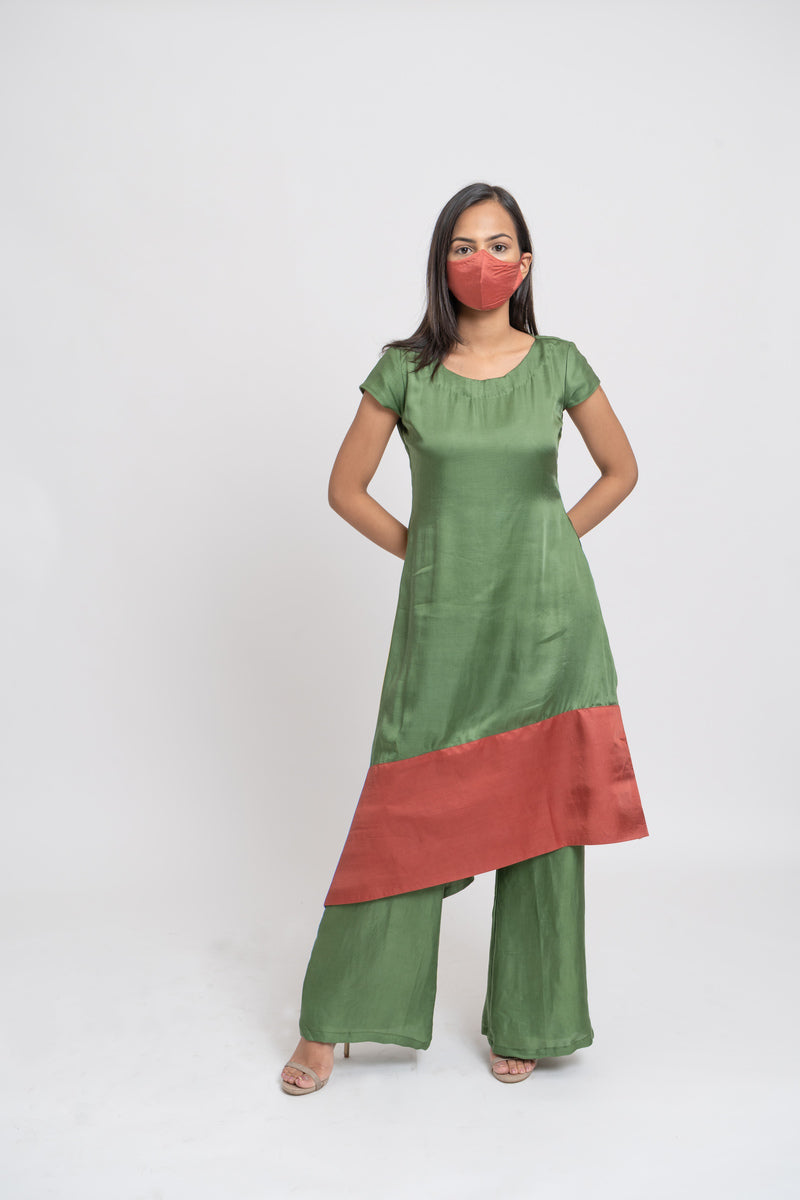 Olive Green and Crimson Asymmetrical Kurta with Cap Sleeves and Wide Legged Olive Pants