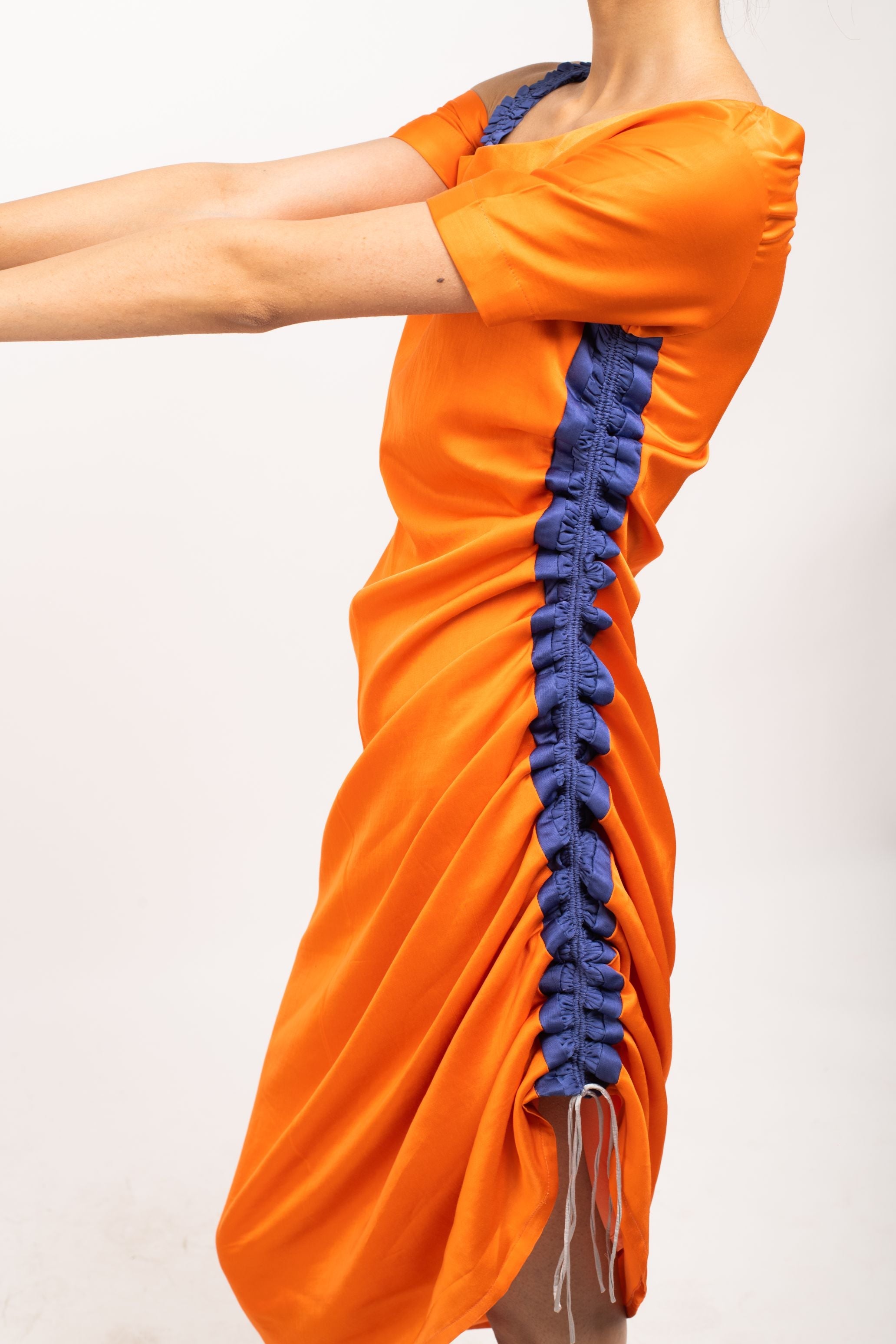 Orange-Blue body fitted one shoulder dress with blue rouching on the side making the length of it enitrely adjustable according to personal liking