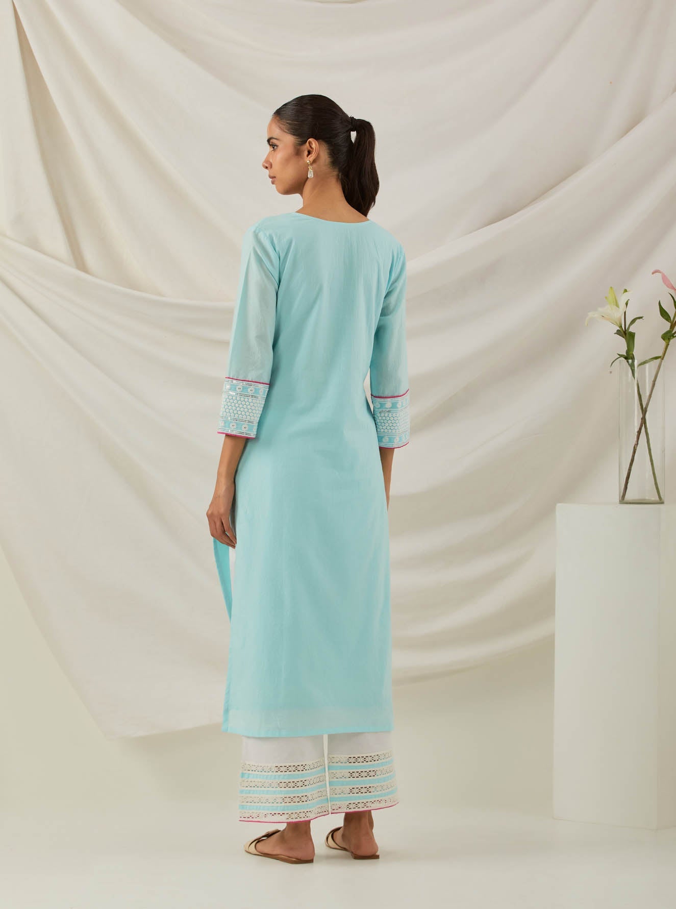Dreamy cotton cambric fabric adorned with intricate sequins Chikankari embroidery on the yoke and sleeve hem of this 'Rooh' Straight Kurta. Special TIC finishing touches like pockets for your essentials have been added in the kurta to make you feel cherished. This classic kurta can be styled for a variety of occasions and be worn as a minimal look paired with white bottoms; or glammed up with your favourite contrast colour.