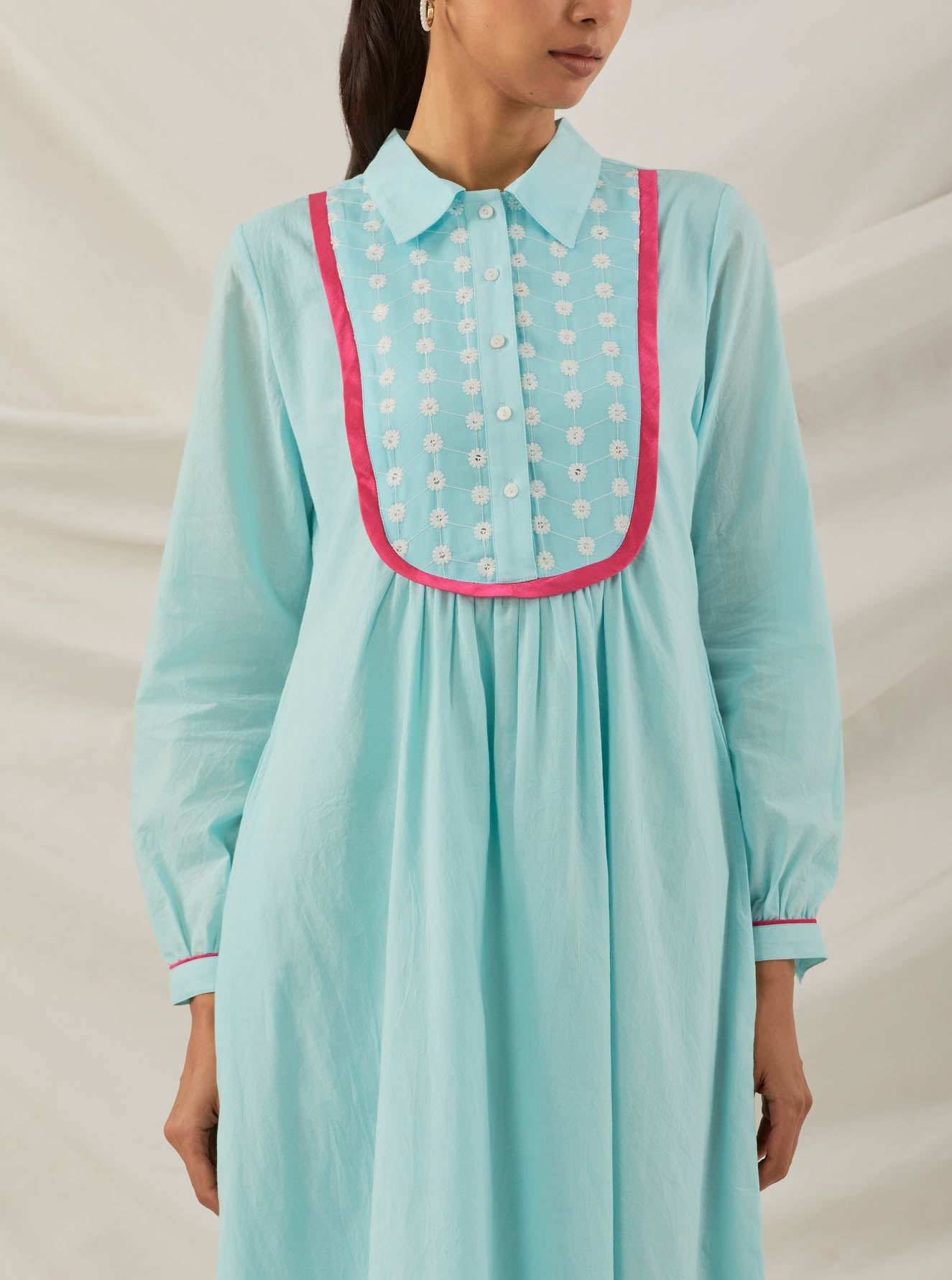 Blue Plain Zaid Collared Long Custom Made Dress With Chikankari Yoke