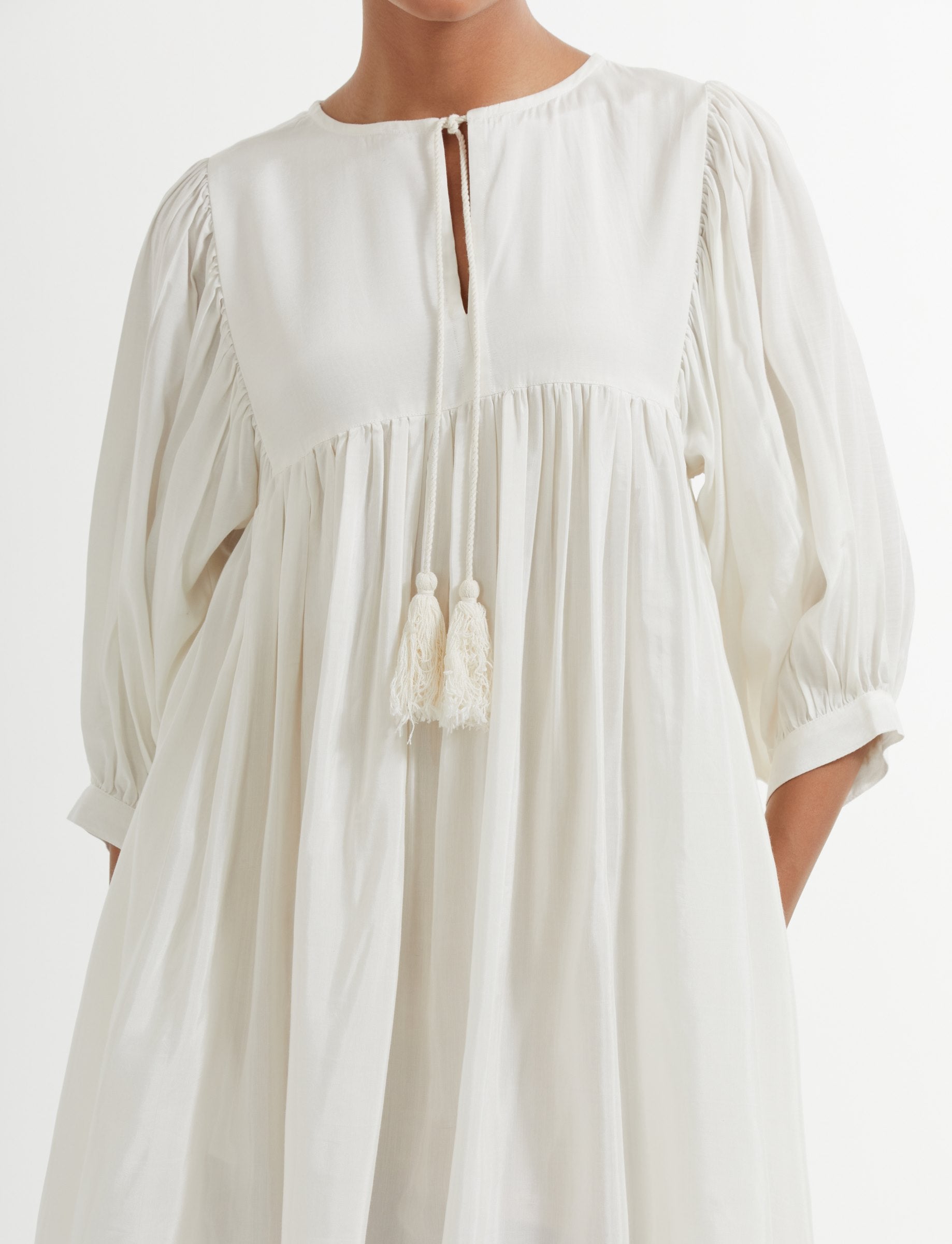 Tahiti, a truly inspired Tahitian dresses and relaxed lifestyle , is perfect mini summer dress. Crafted out of softest vibrant silk fabric, the Tahiti has a round neckline with twisted cotton cords , puff shoulders and easy breezy mini skirt with pockets, evoking a relaxed and happy summer holiday vibe.