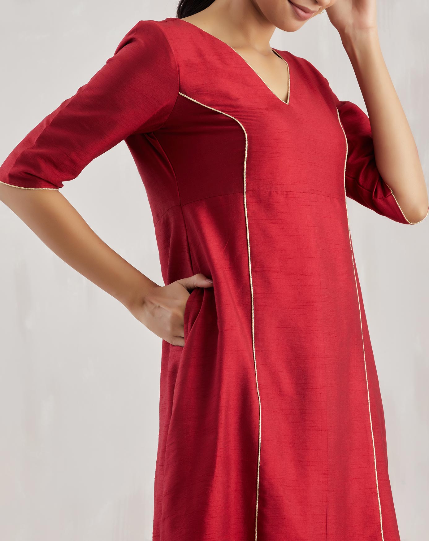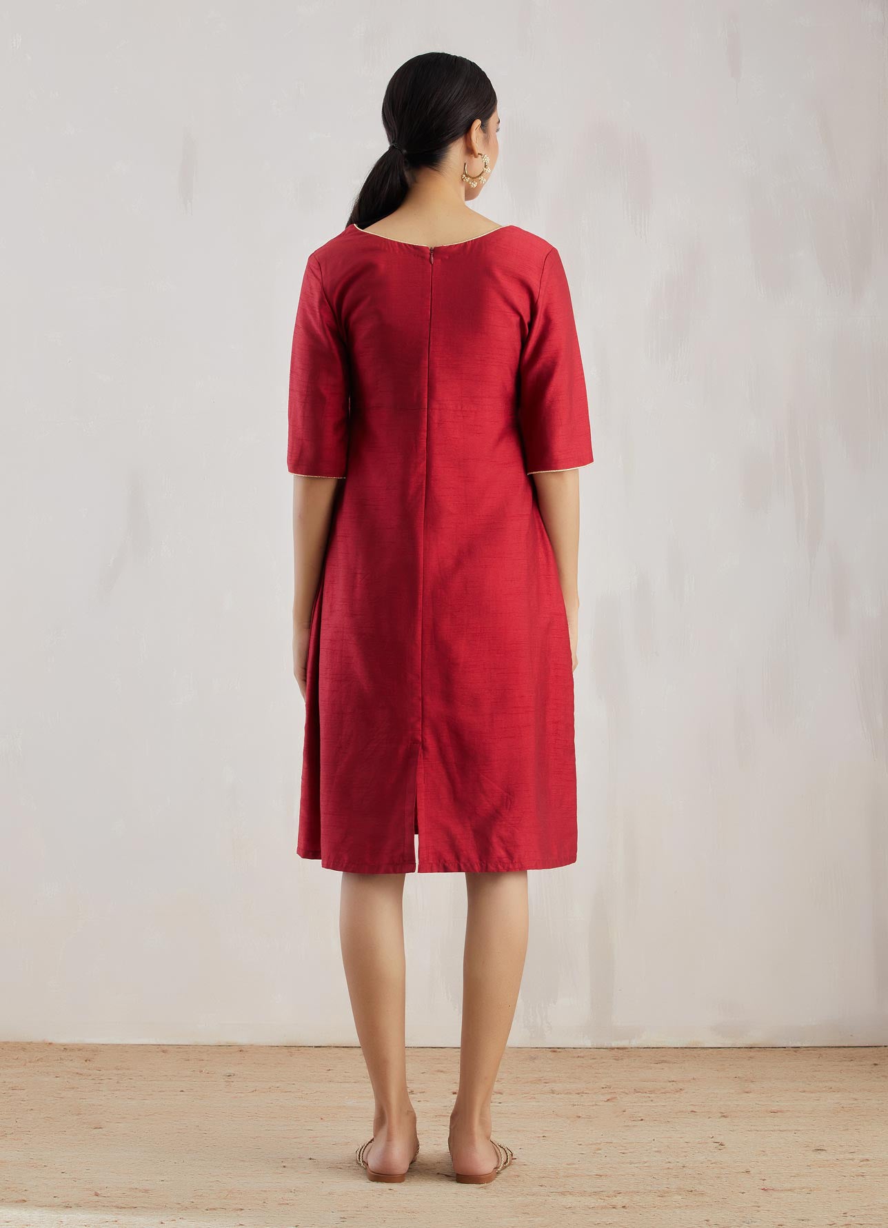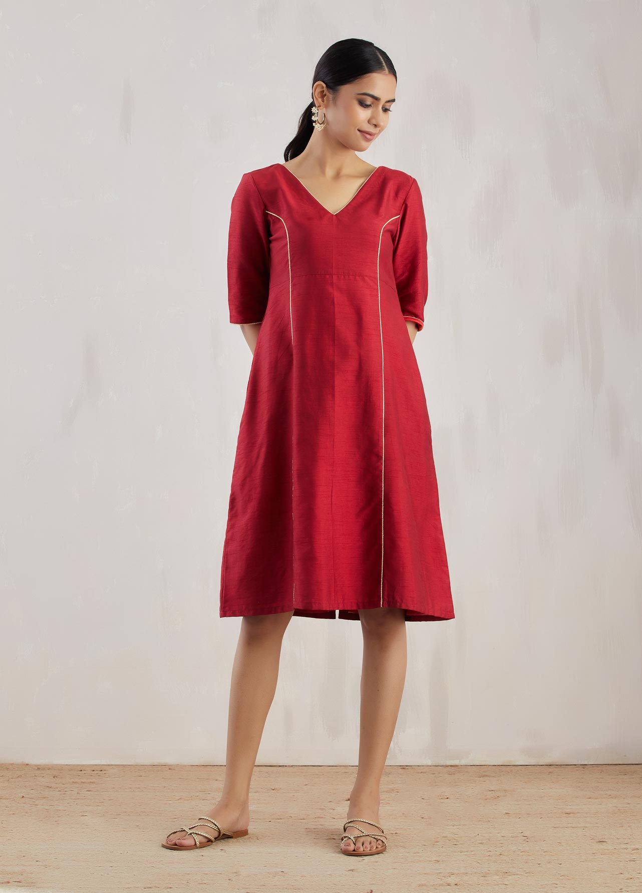 The dress designed in silk dupion fabric features a straight structured cut. The dress features elegance to its best.