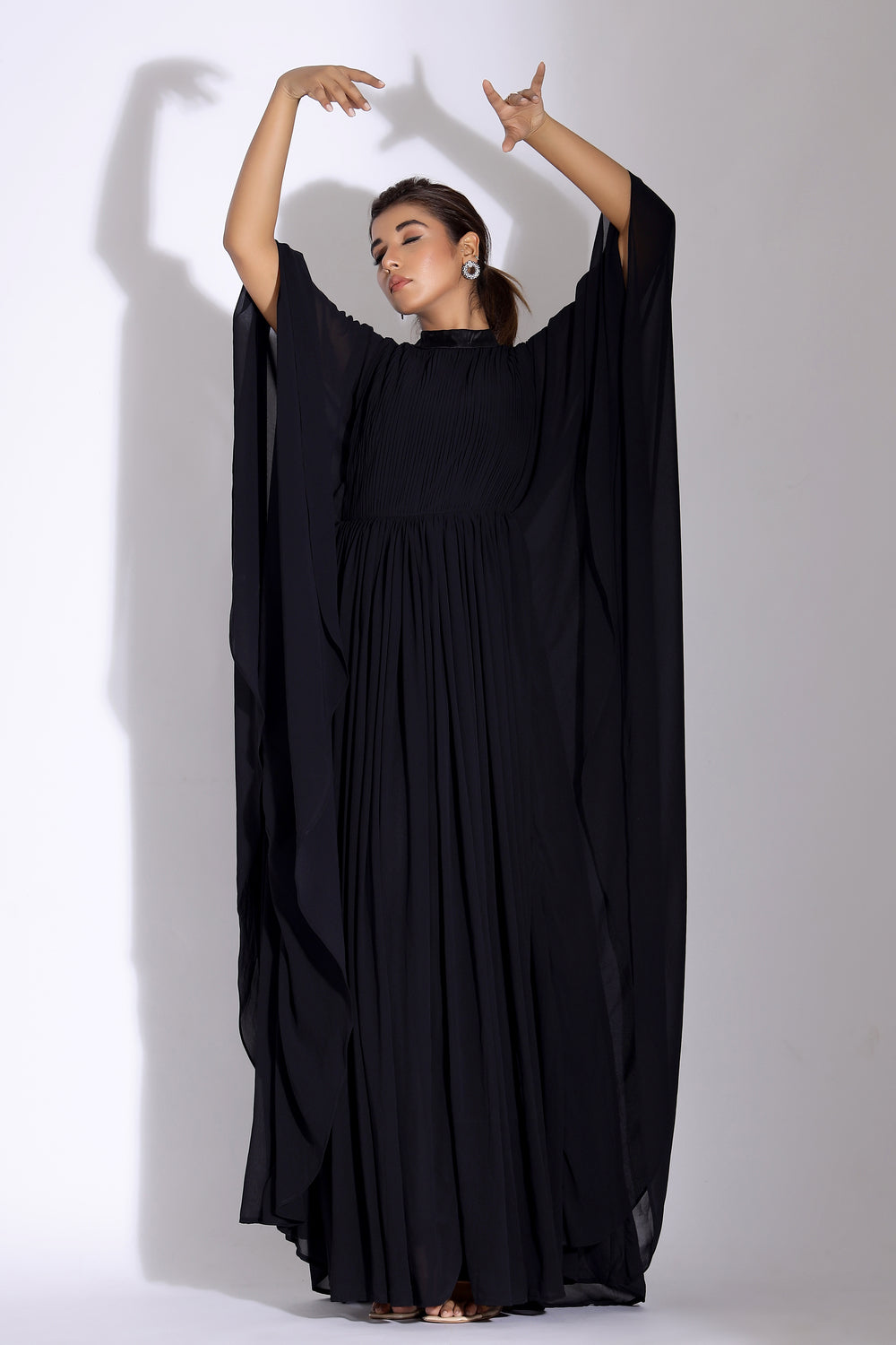 Stylish and Comfortable - that's our Pleated Kaftan Gown ! It features high neck in satin, pleats on bodice and flared skirt. Pair it with long earrings and heels.