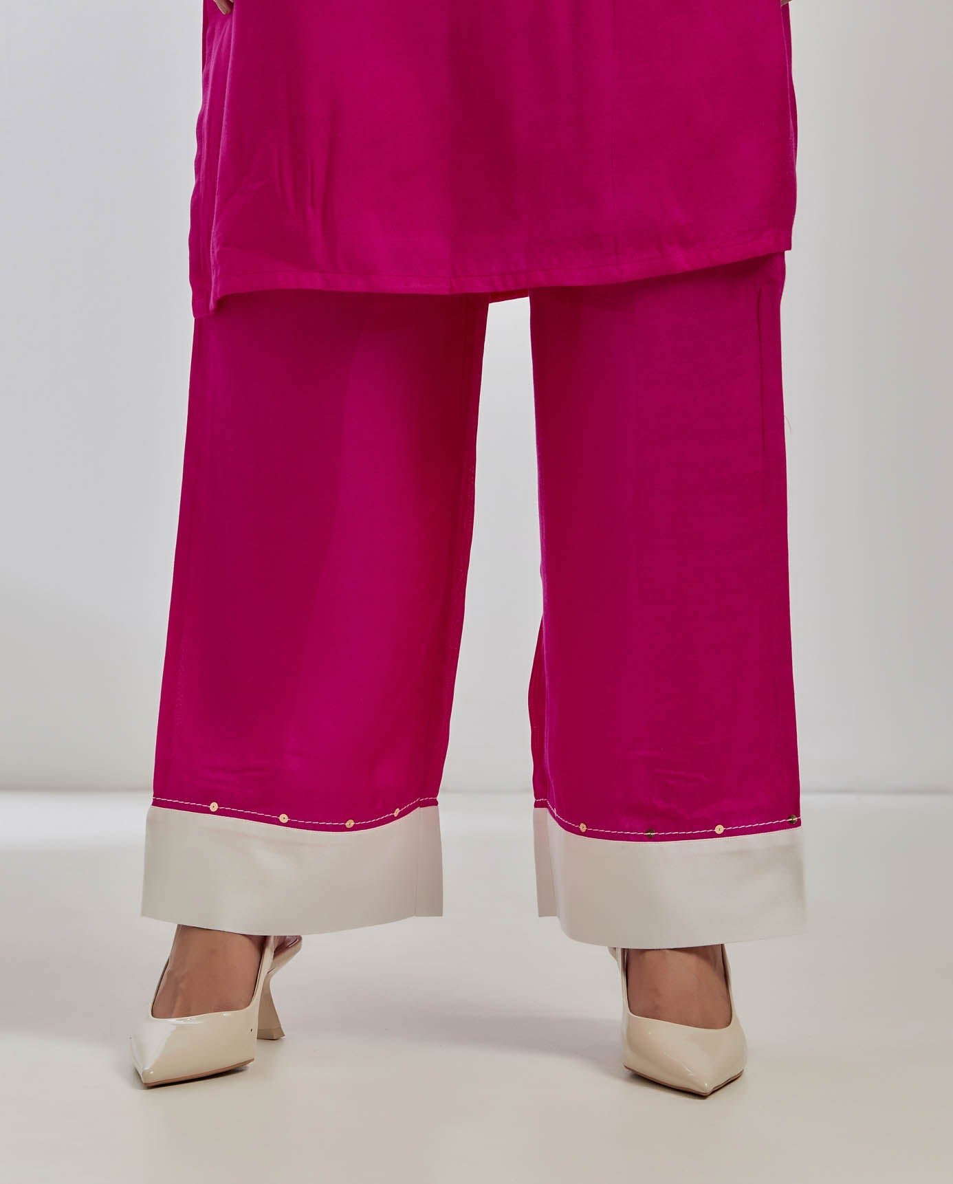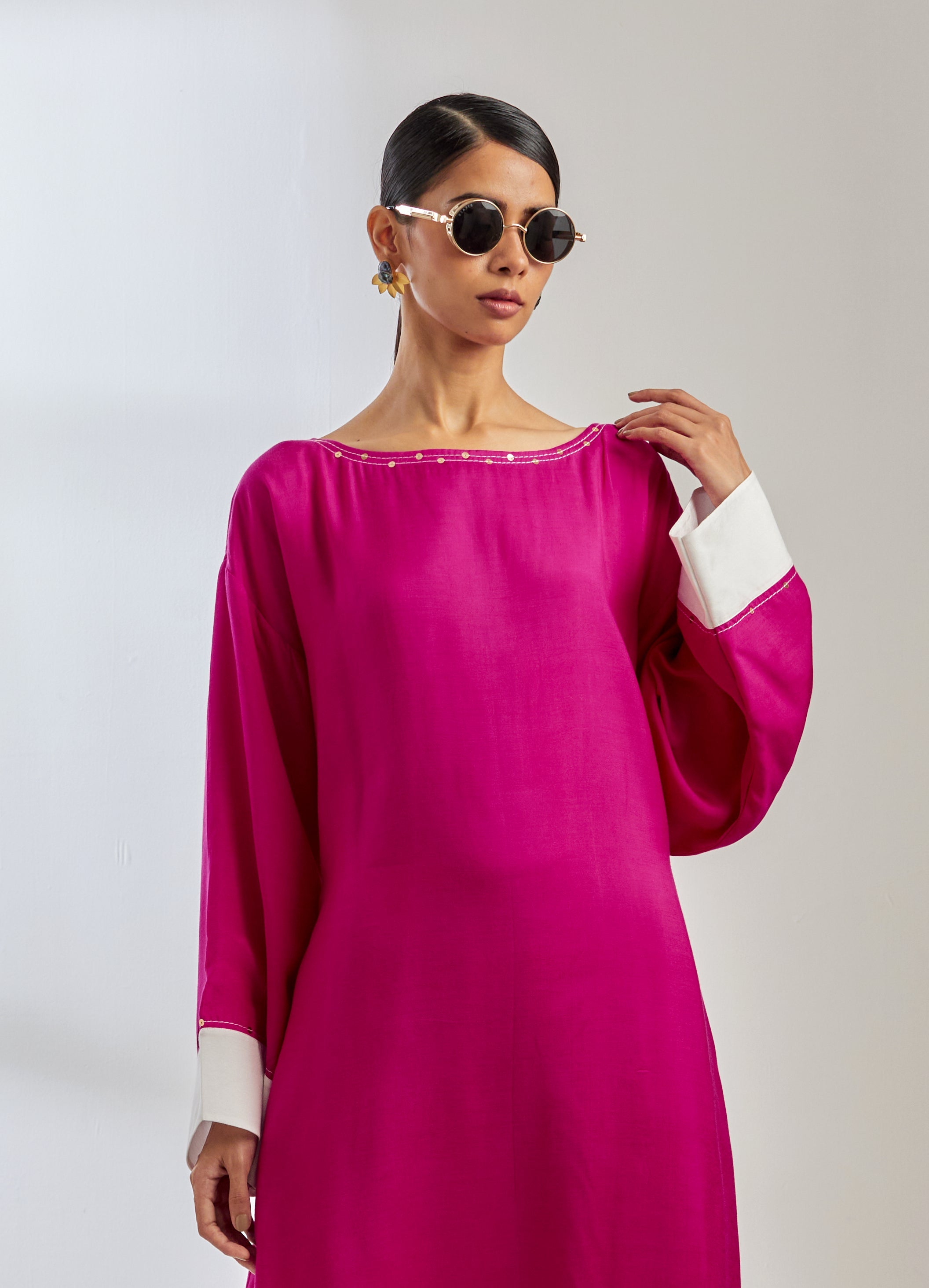 Silk kaftan kurta in bright pink color and white details on sleeves with sequins embroidery on sleeves and neck line. This breezy kurta is paired with a pink palazzo pant with white detail and sequins embroidery details.