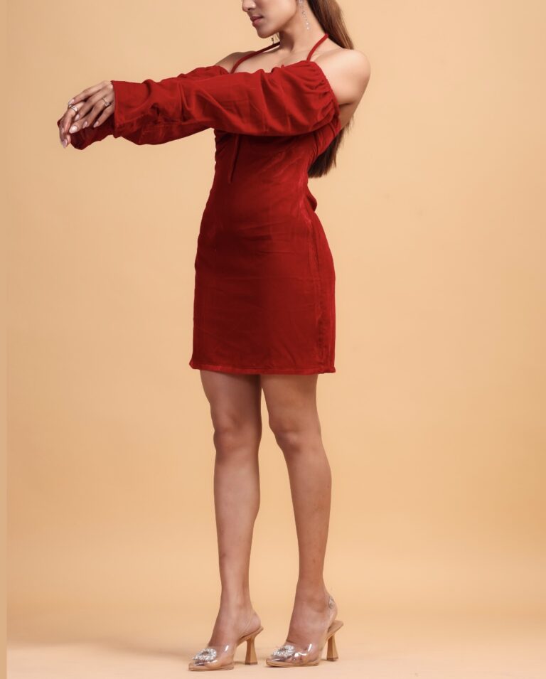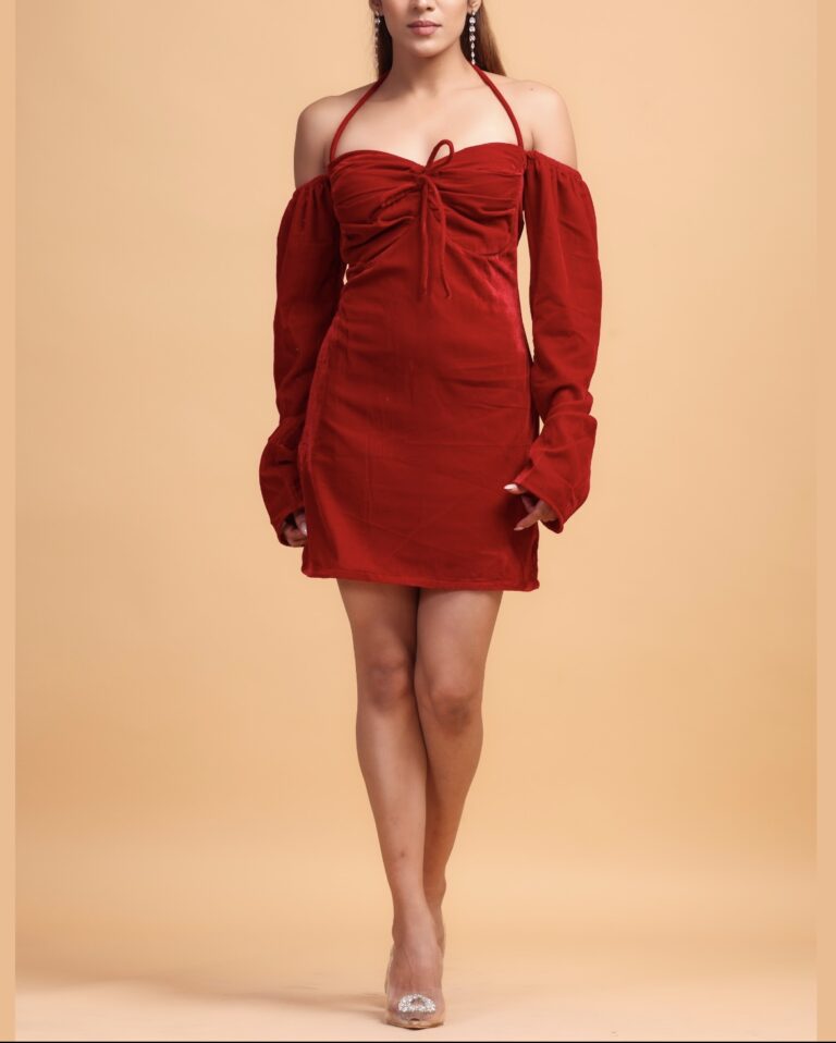 Baby Doll Mini Velvet Dress has a rich Maroon hue we’re loving. Cut from Shiny Valvet fabric, it has gathered detail at chest that creates the most amazing cleavage with halter neck ties for the perfect fit.