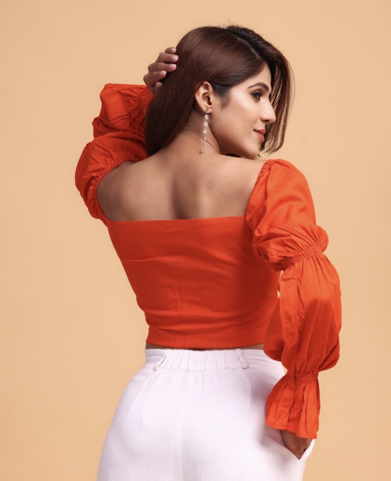 BOSSY TOP Cute top with a beautiful sweetheart neckline which comes with bell sleeves with elastic gathered detailing. Cut from our Sustainable cotton fabric the crop top carries a very feminine feel, suitable for both party and official meets.