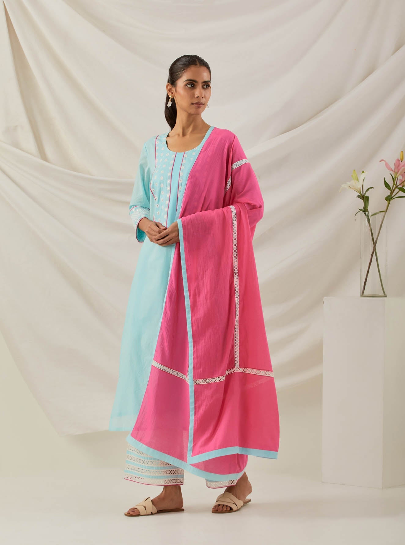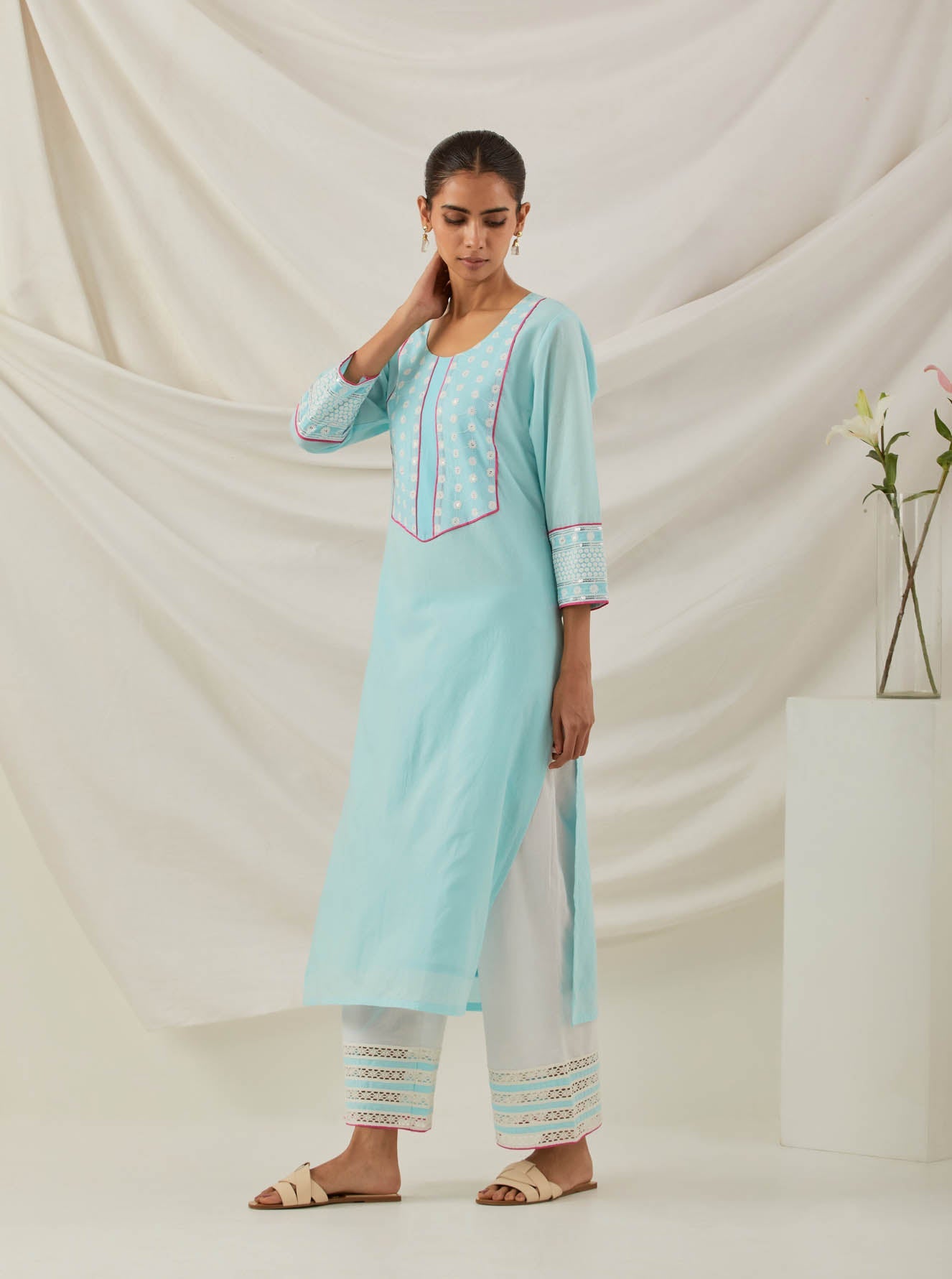 Blue Plain Rooh Straight Kurta With Chikankari Yoke Details and Palazzo with wide lace detail & Dupatta (Set of 3)