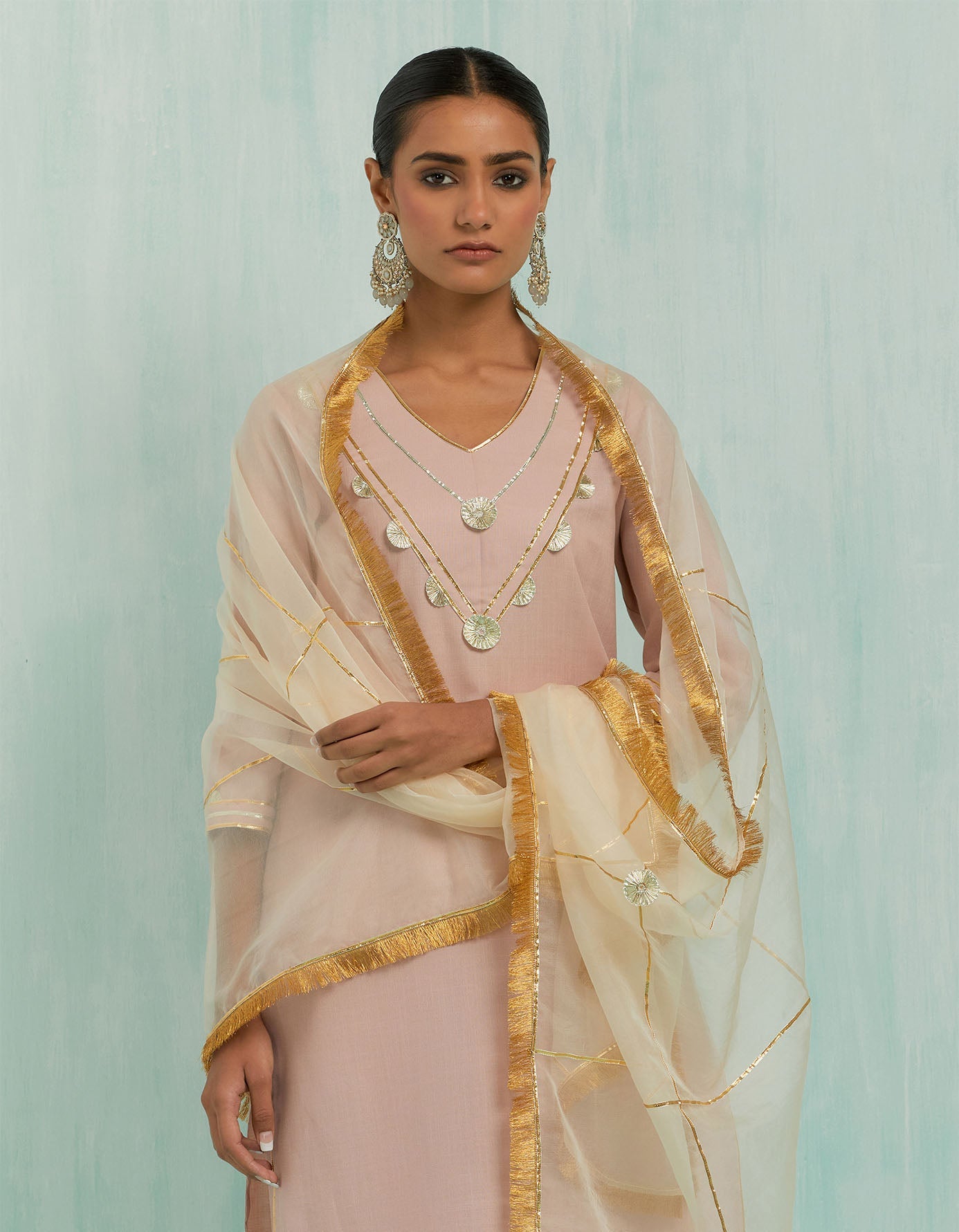 Pale Pink Mira Straight Kurta And Palazzo With Gold Silver Gota Details & Dupatta (Set Of 3)
