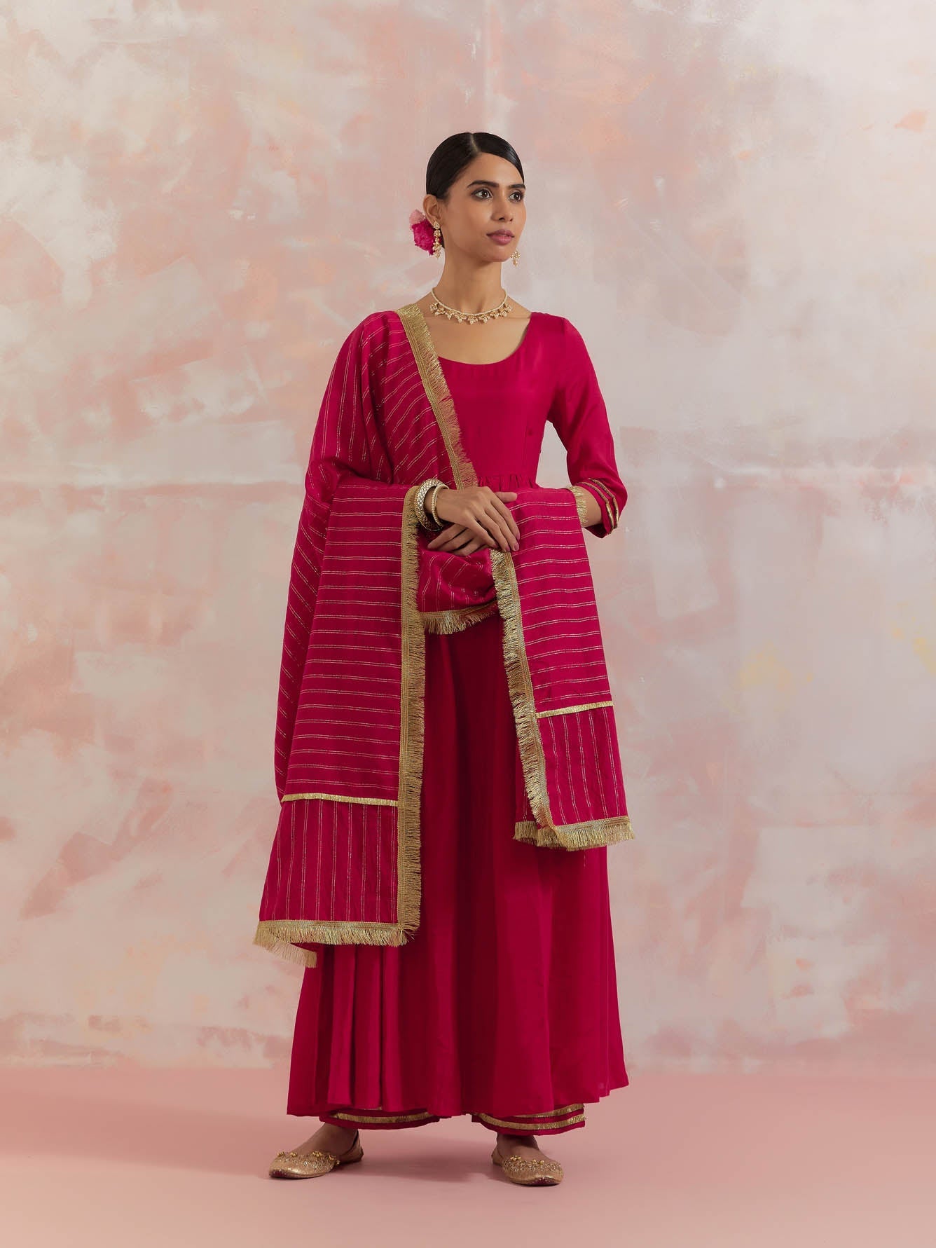 Silk Anarkali kurta in bright red color with kiran lace details on sleeves. This kurta set is paired with a chanderi zari stripe dupatta and palazzo pant with kiran lace details. Get the festive vibe going with this shimmery ensemble.