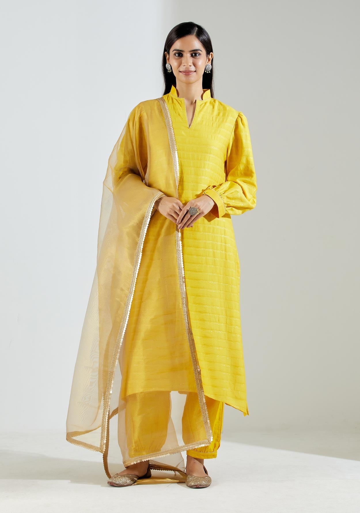 The half collar kurta is crafted in chanderi woven zari stripe fabric with detailing on the sleeves. It is paired with matching salwar in silk dupion fabric and a gold tissue dupatta.