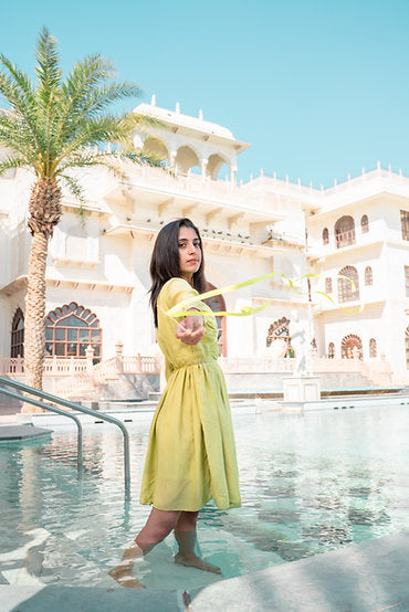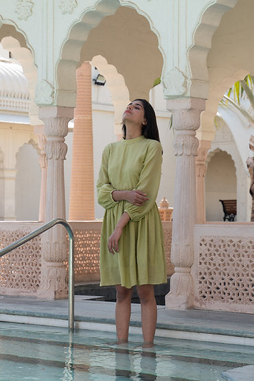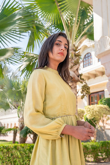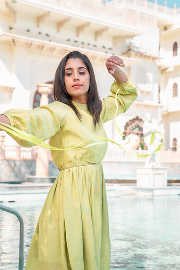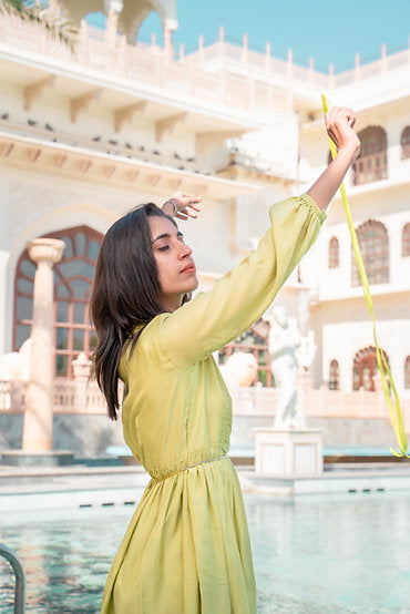 Inspired by the generosity that shades of green hold, with meticulous beadwork details on the neck, this windy meadows dress is versatile to fit in every event. With its puffed sleeves & gathers on the waist, this dress is designed to slip into comfortably yet elegant ensemble.