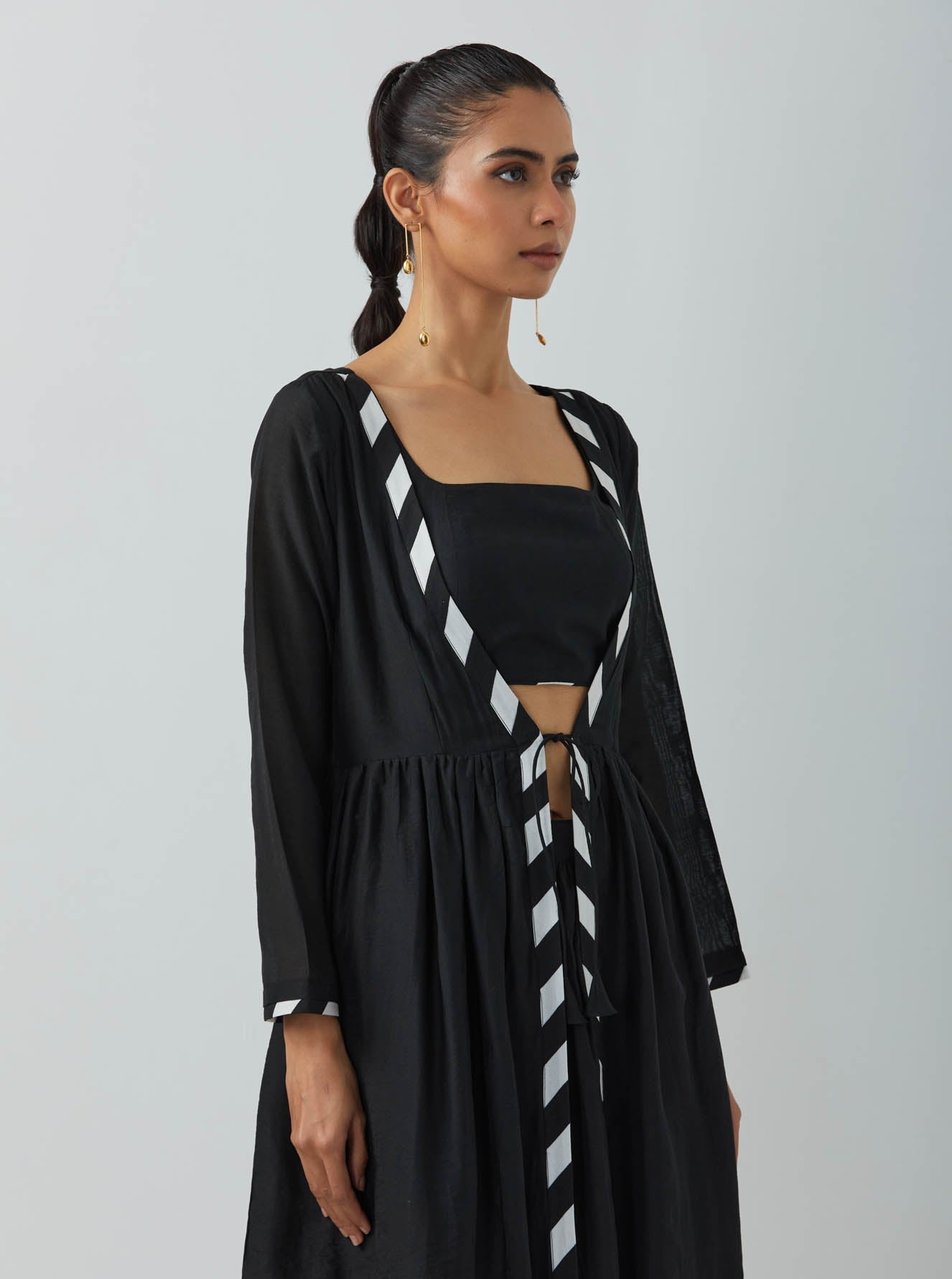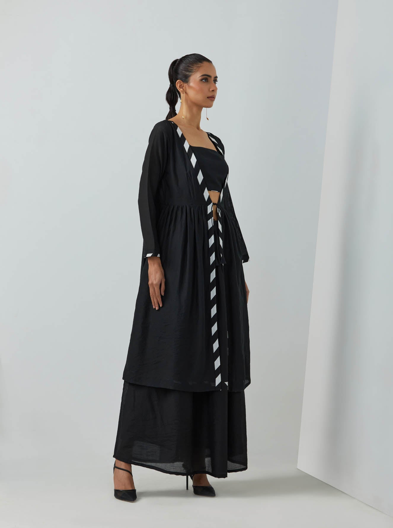 Black overlay in airy chanderi fabric for this summer. The overlay can be teamed with any outfit to dress up or dress down!
