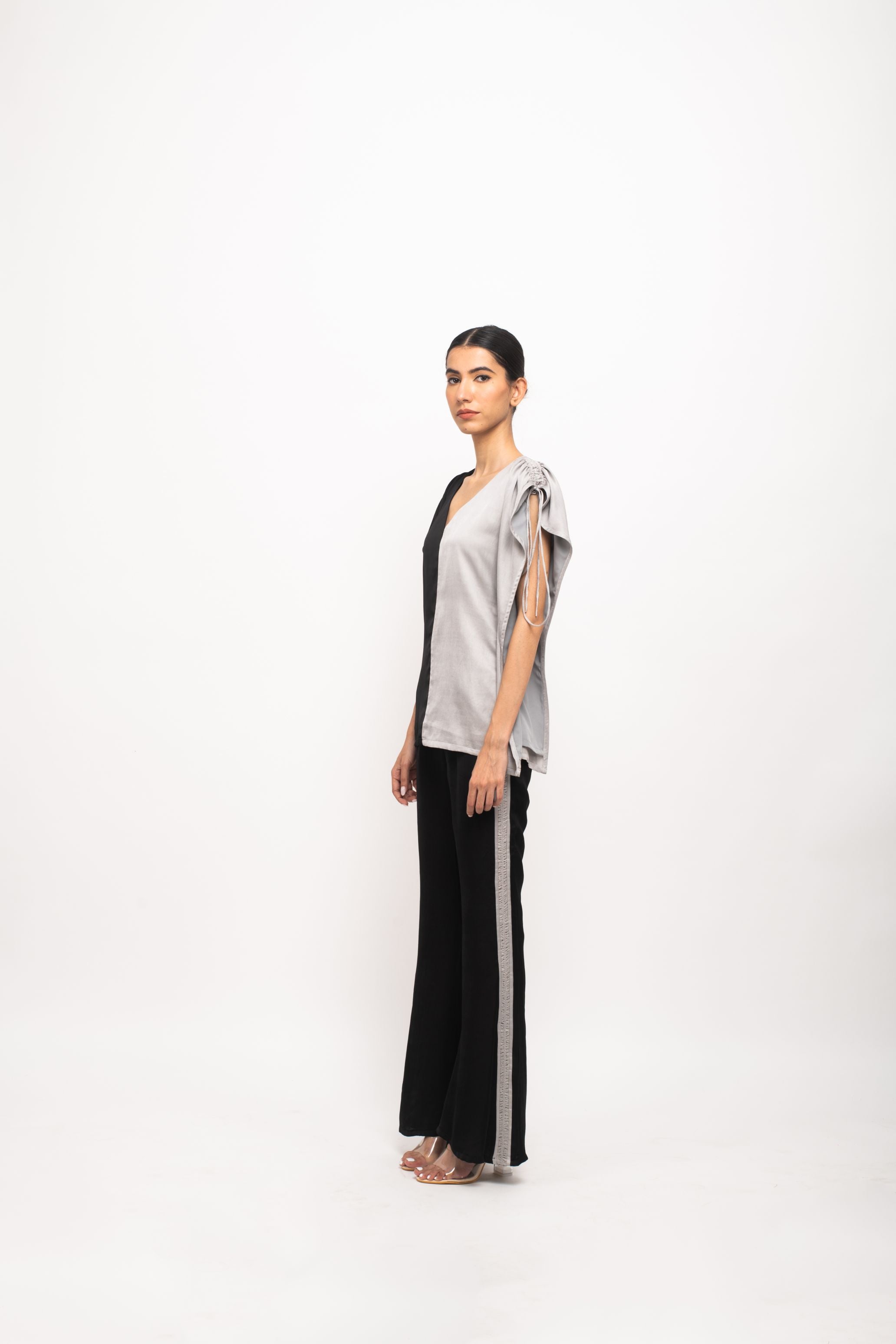 Black-Grey Half and Half Kaftan Top with rouching on the sleeves and black bell-bottoms with rouching on either sides