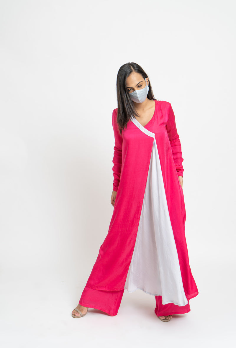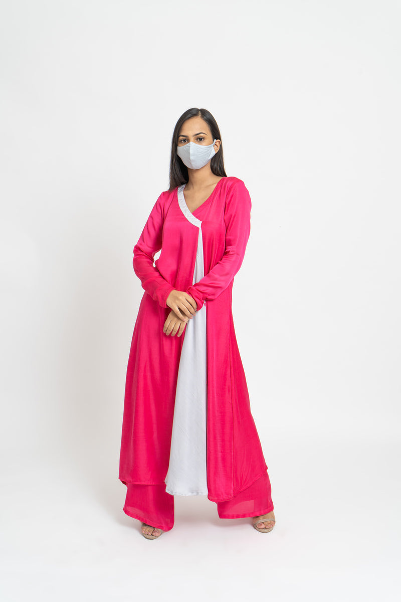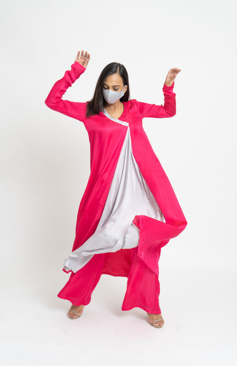 Fucshia and Grey Panelled Colorblocked Kurta with full sleeves and Wide Legged Fucshia Pants