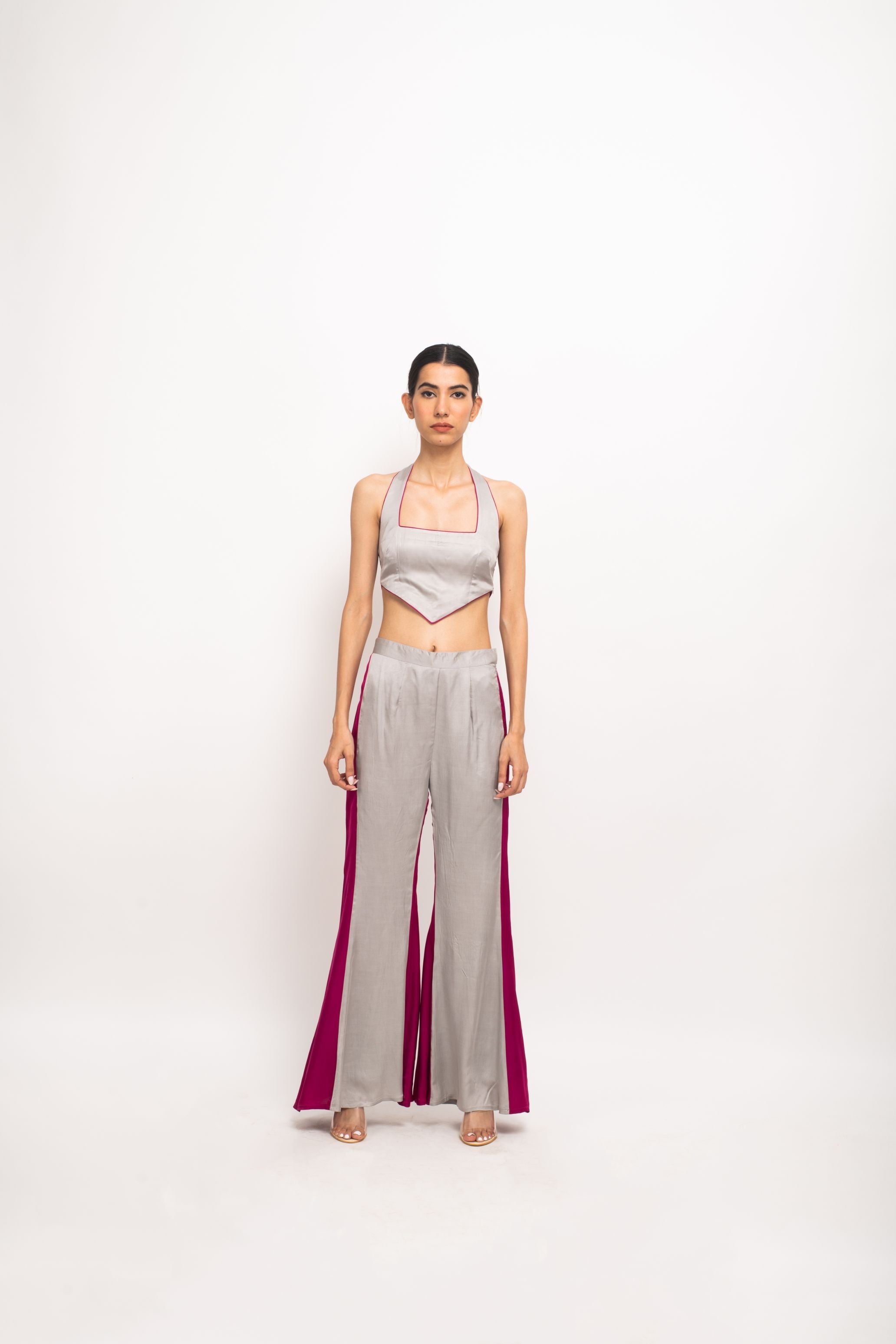 Grey-Wine two piece co-ord set; grey halter neck bustier paired and an Grey-Wine panelled flared pants