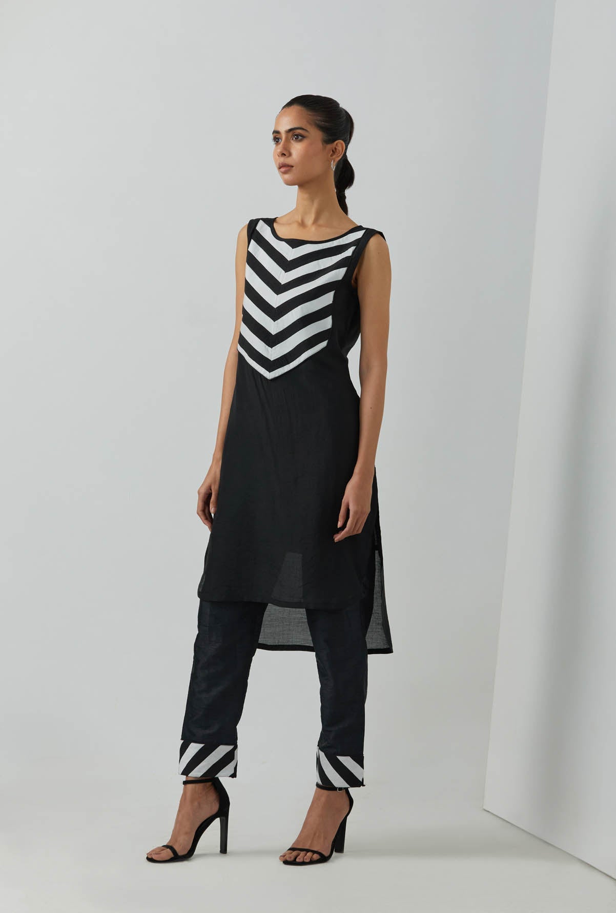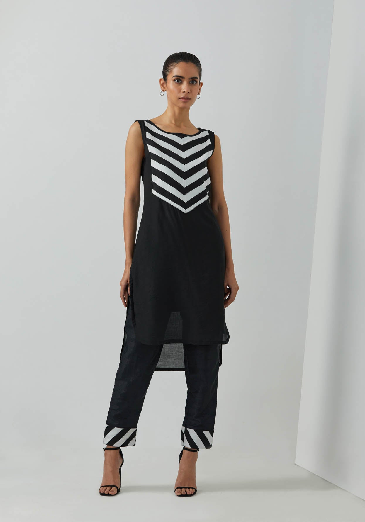 Black high-low kurta best paired with straight pants. Features chevron details at neckline.