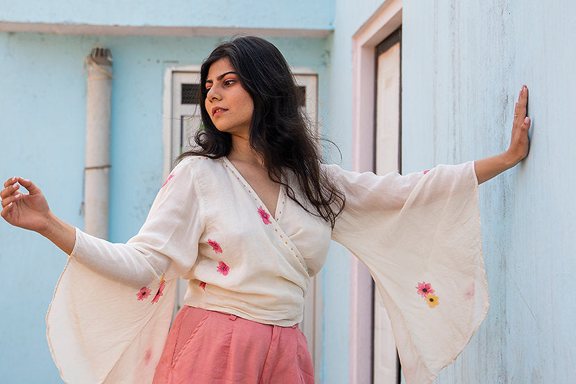 Made with silk cotton, this wrap around top is made with the perfect pattern to make your weekends in more ease. The running stitch on the neckline blends perfectly with the floral digital prints on the white surface. Adding more comfort with those bell sleeves. You can either pair it up with your daily routine pants for that casual look or go for a circular flared skirt which will be a perfect pick for an evening party.