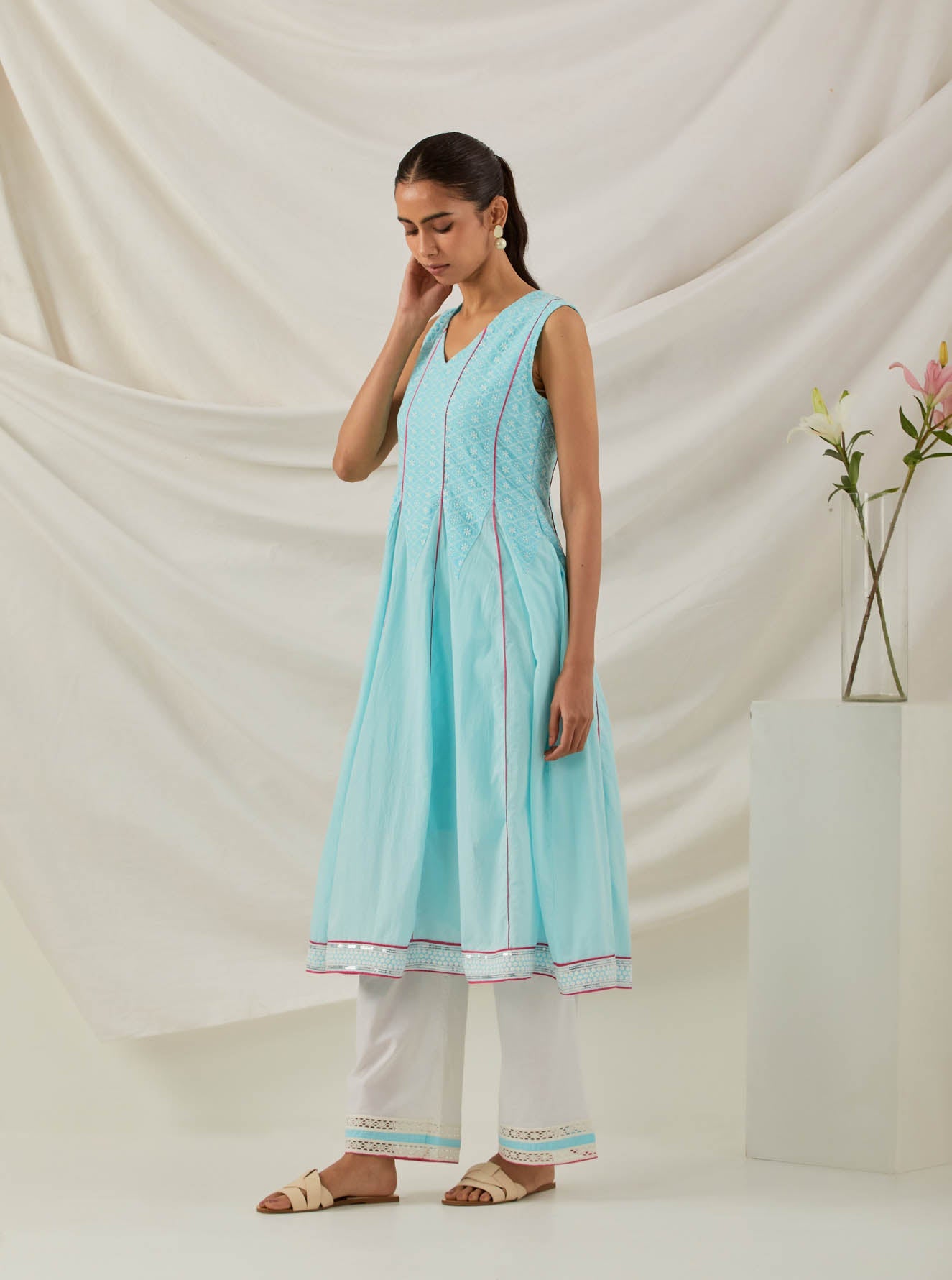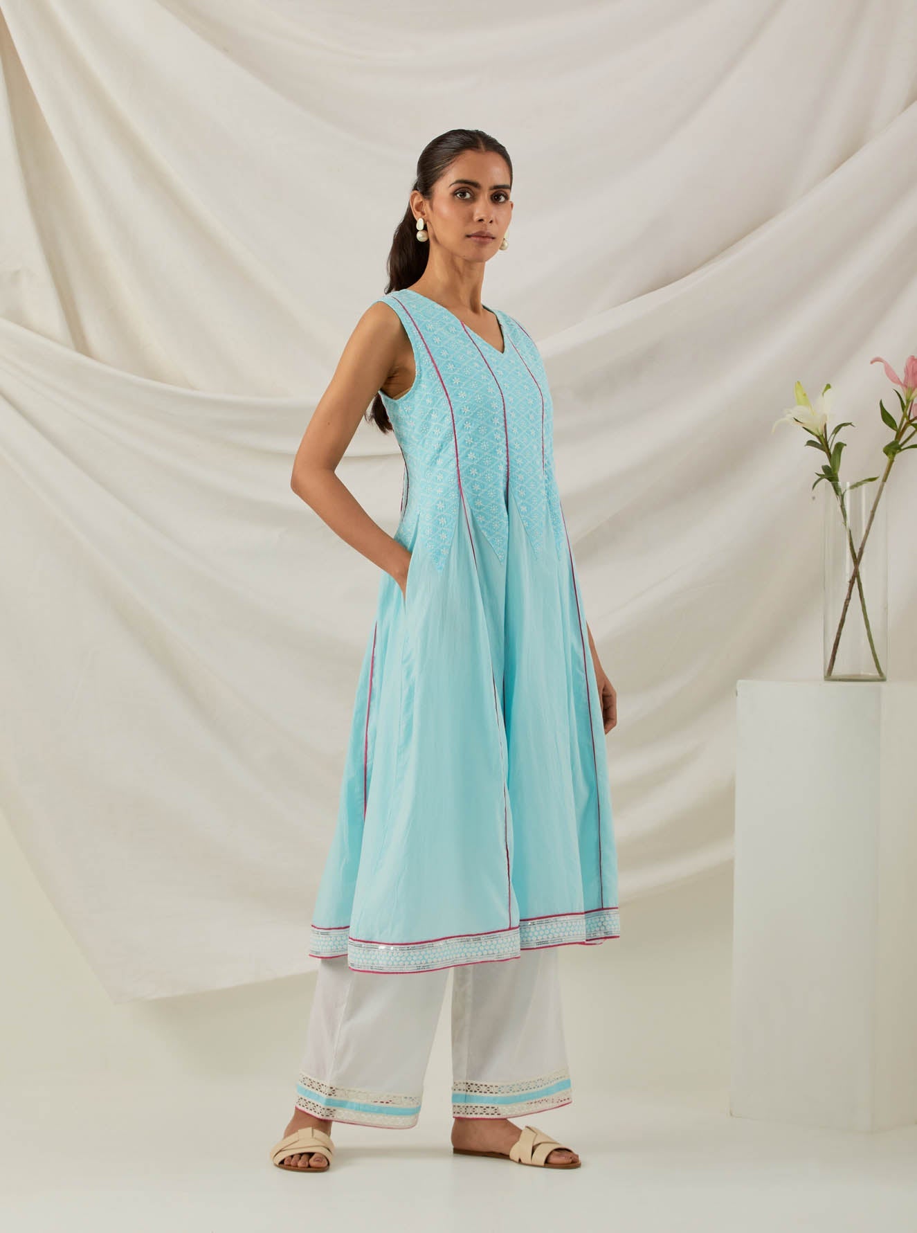 Blue Chikankari Mastani Kalidar A-Line Kurta and Palazzo with lace detail (Set of 2)