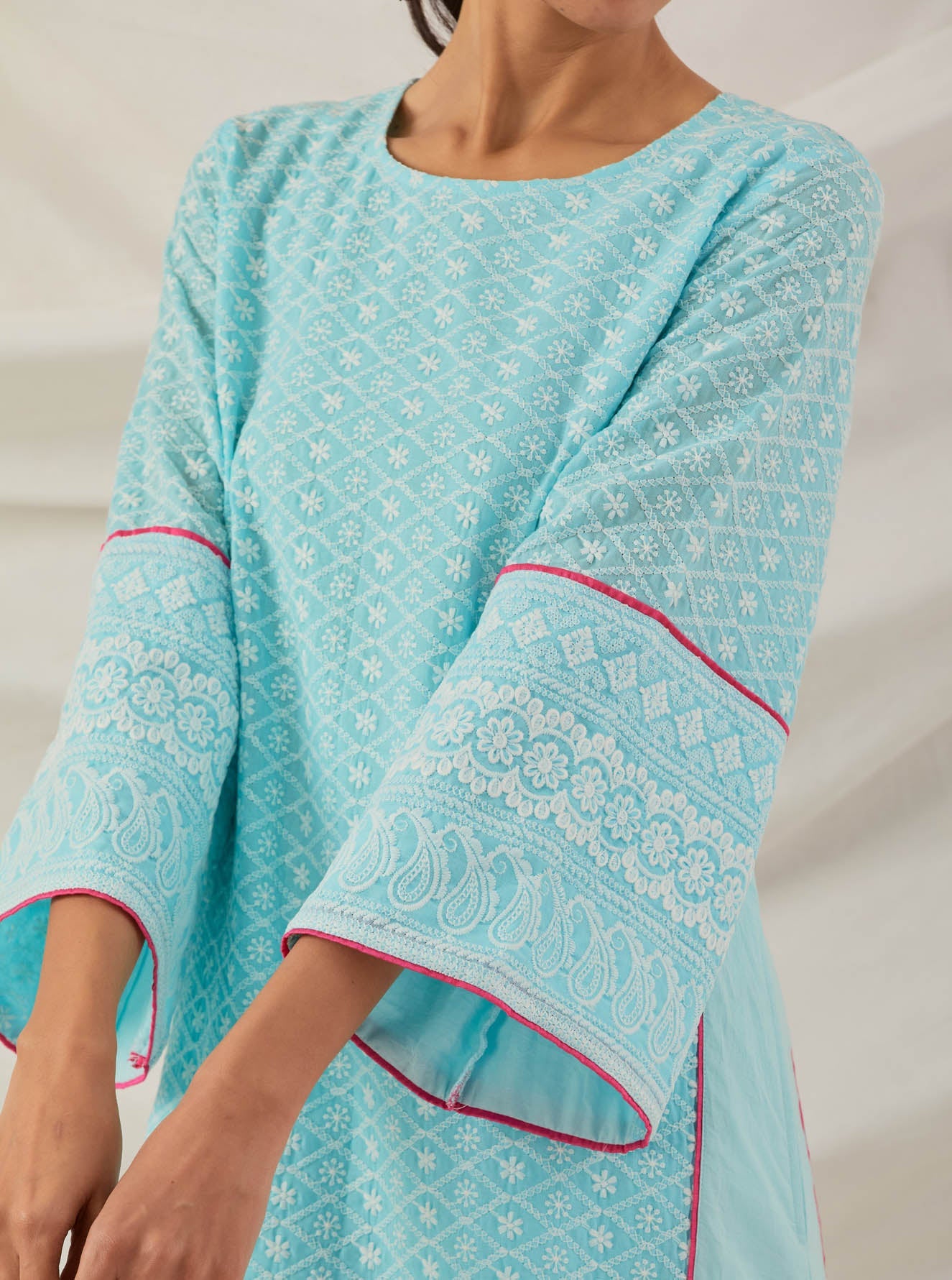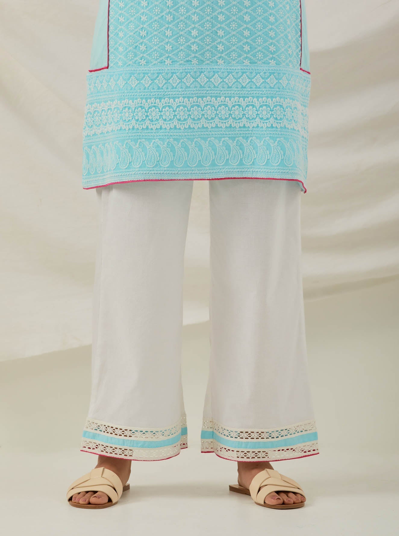 Blue Chikankari Pak Wide Arm Kurta and Palazzo with lace detail (Set of 2)