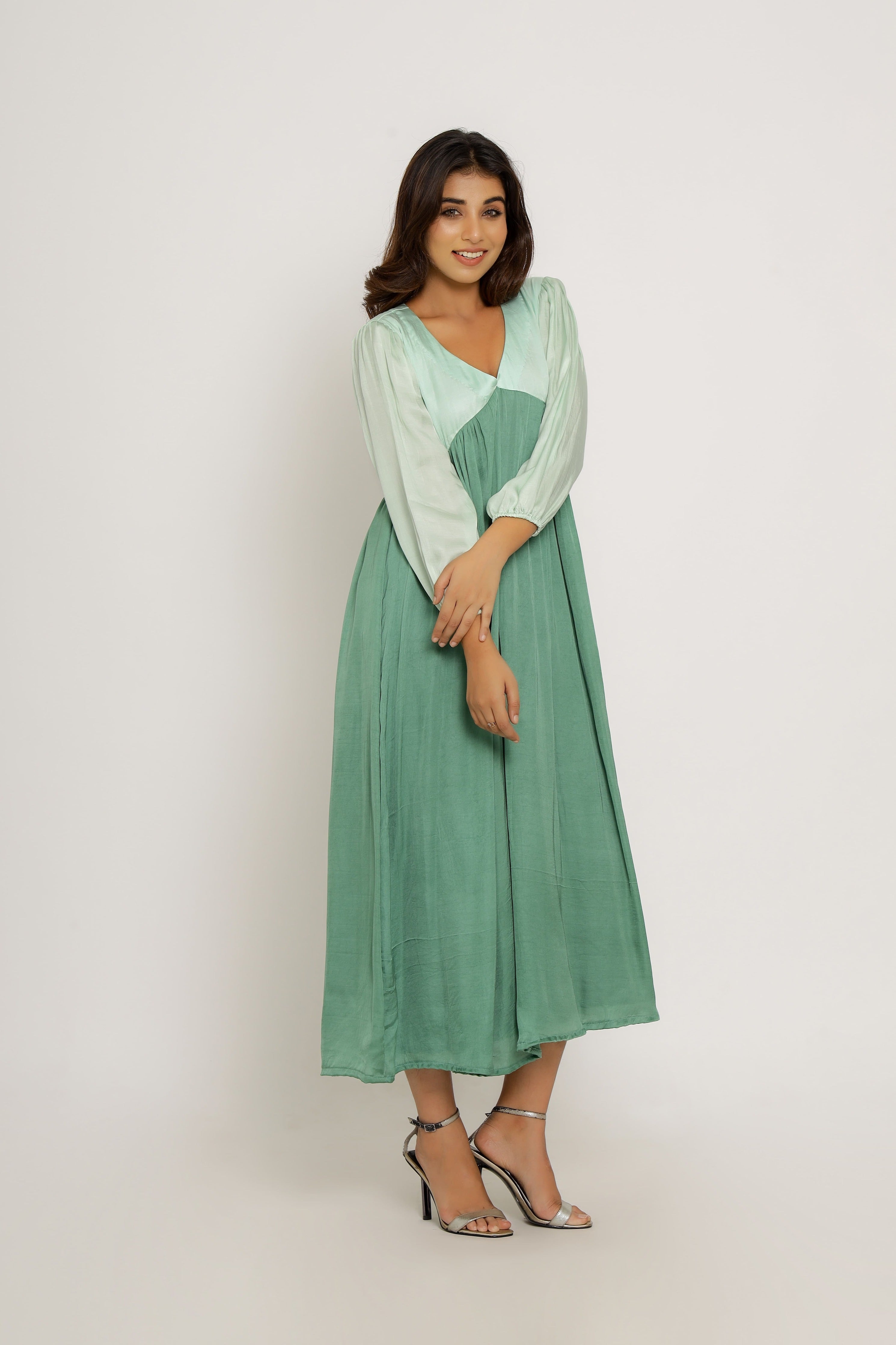 Teal-Tea Green Full Length Dress with Bishop Sleeves and Gathers